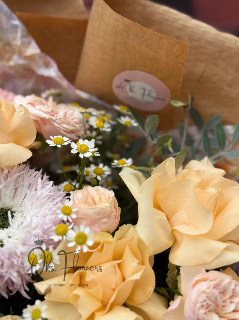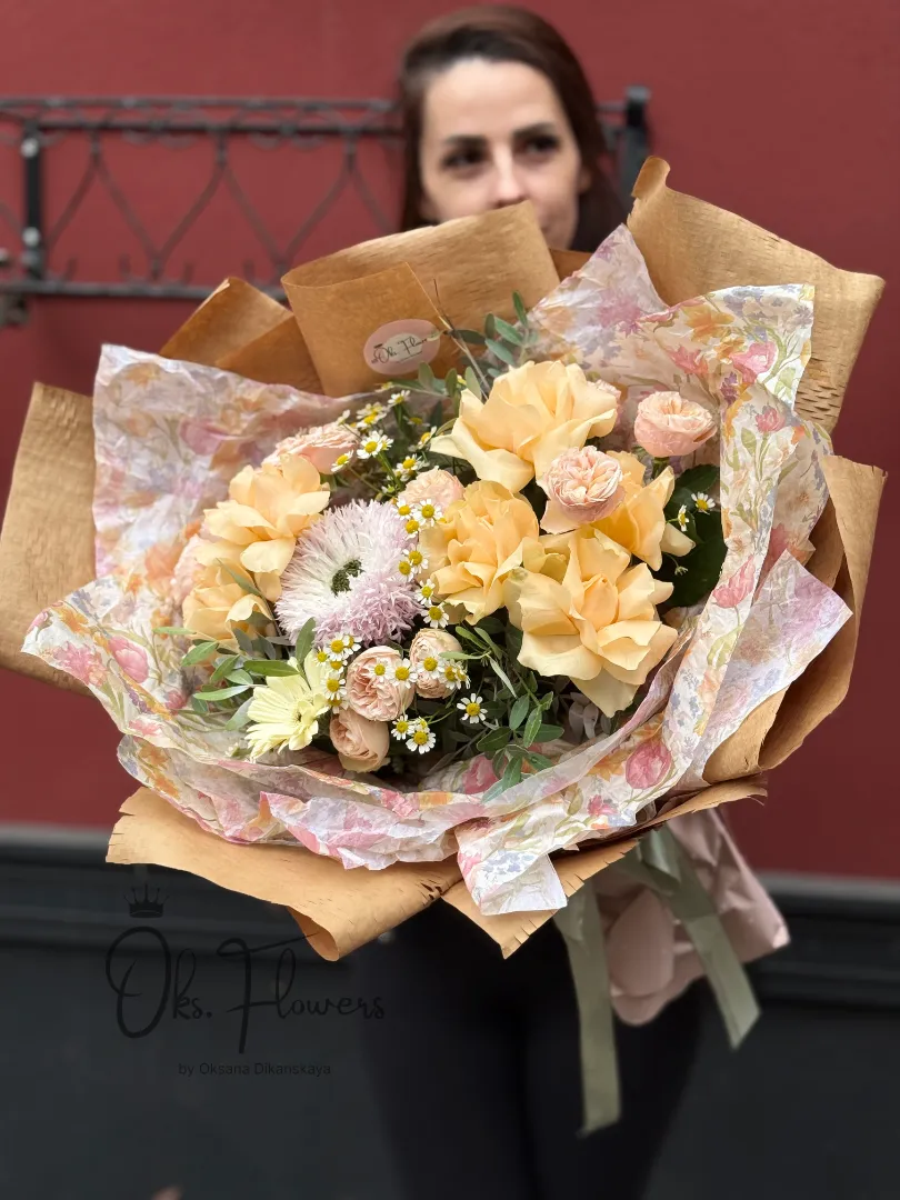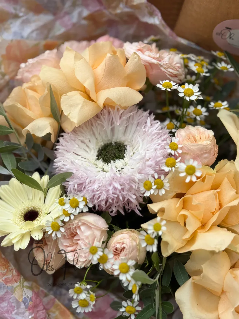 Подарите близкому человеку не просто букет — а «Сад Уютного Вечера». Это композиция, созданная для тех, кто ценит нежность, спокойствие и изысканную простоту. Крупные персиковые розы, нежно-розовые пионовидные розы, белые ромашки, образуют гармоничный ансамбль, словно сотканный из закатных лучей и вечернего прохладного воздуха. Дополняют композицию свежую зелень — придающие объём и текстуру.