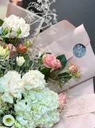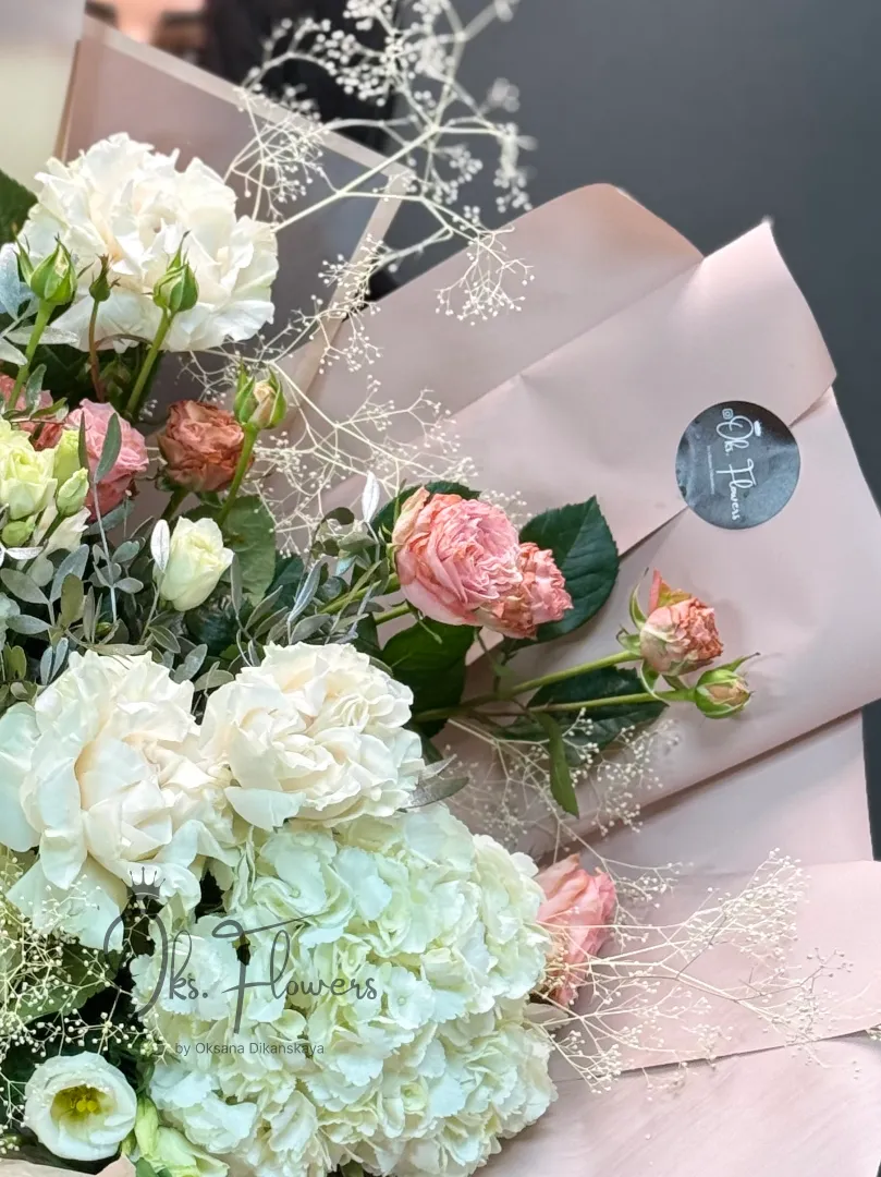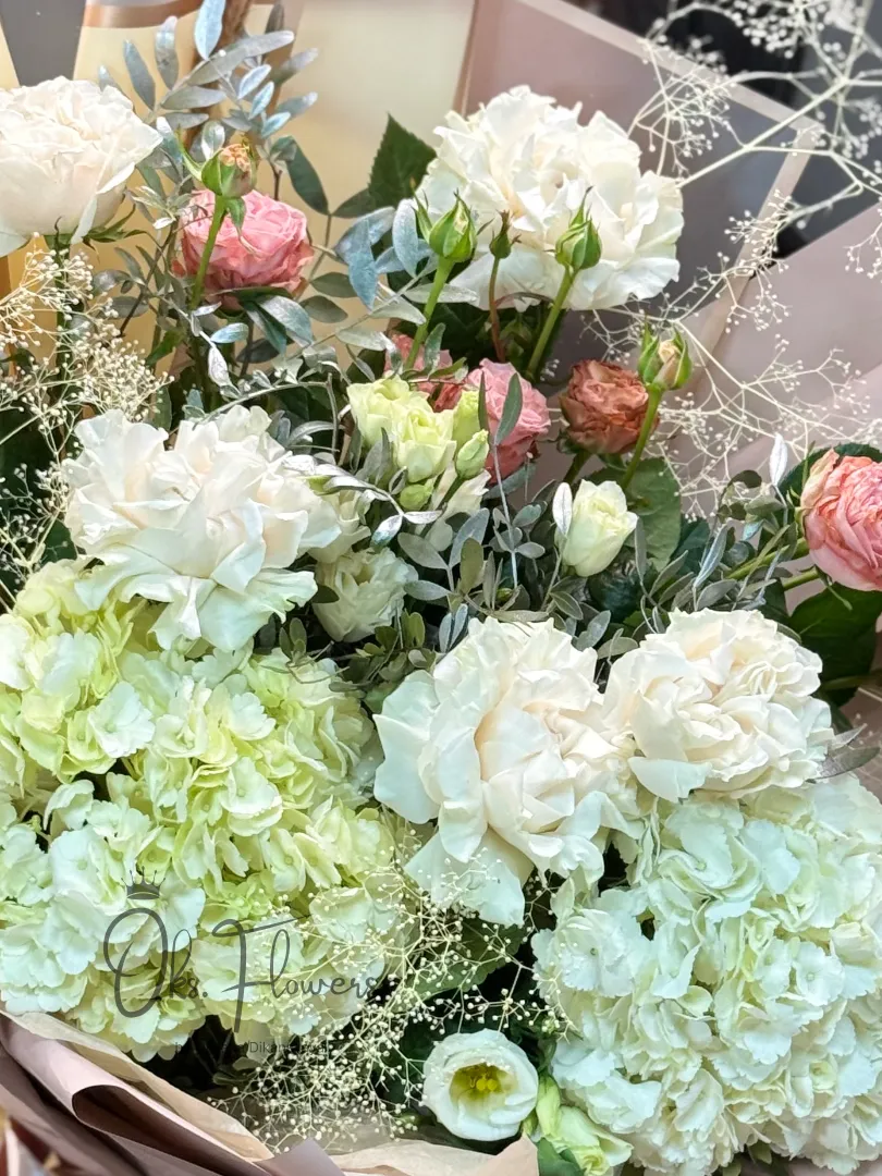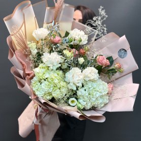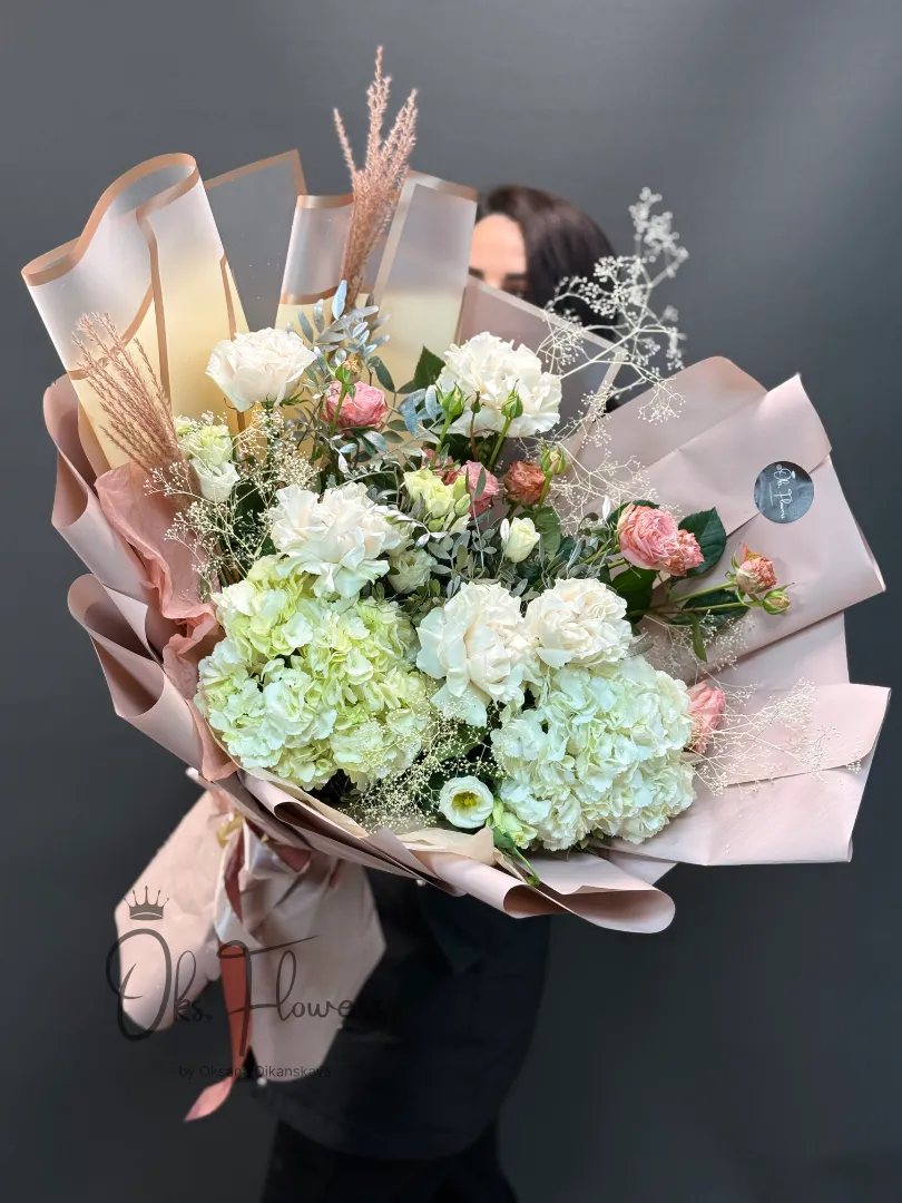 Это утончённый, воздушный букет, где белоснежные розы, пастельные гортензии и нежные сухоцветы сливаются в гармоничный ансамбль — словно сад, замерший в моменте совершенства. Упакованный в пастельную бумагу с золотым акцентом — он идеален для тех, кто ценит изысканность, спокойствие и природную красоту.