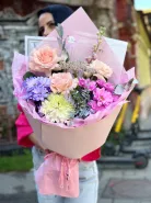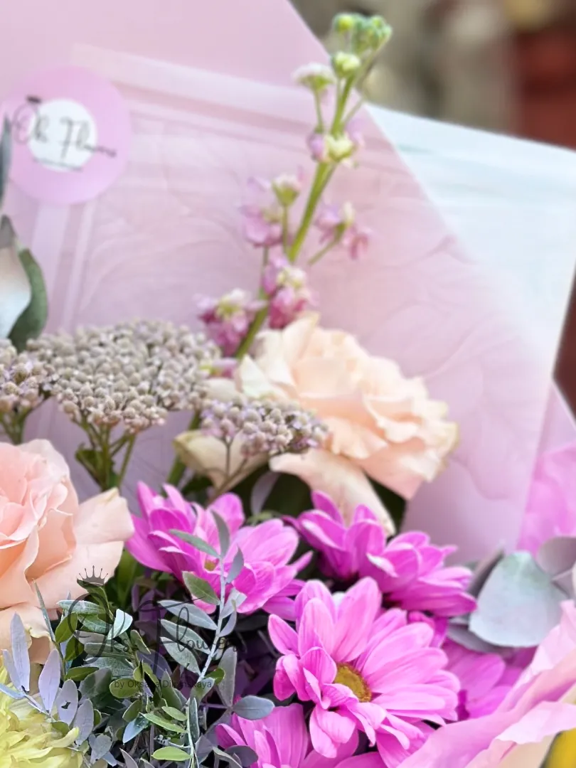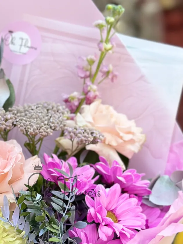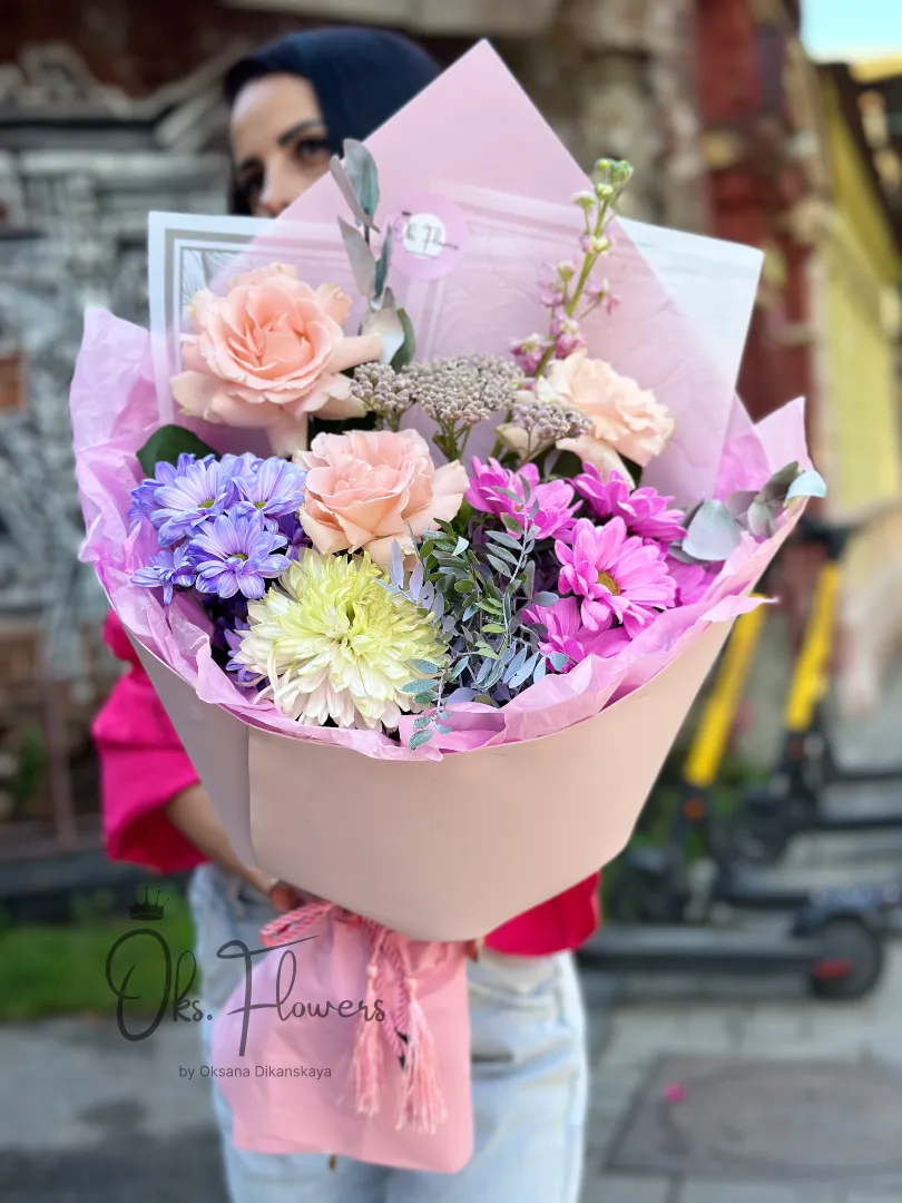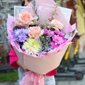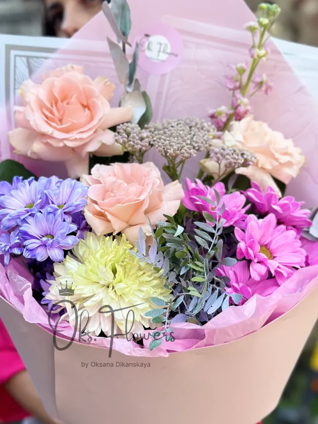 Это яркий, воздушный букет, где нежные персиковые розы, фиолетовые и малиновые хризантемы, пастельные акценты и свежий эвкалипт создают ощущение праздника в каждом лепестке. Упакованная в нежно-розовую бумагу с декоративной лентой — она идеальна для тех, кто ценит радость, женственность и цветную эстетику.