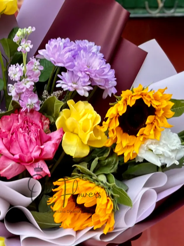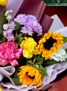 Это яркий, жизнерадостный и энергичный букет, где солнечные подсолнухи, насыщенные розы и пастельные хризантемы создают ощущение праздника, тепла и радости. Упакованный в контрастную бумагу с лентой — он идеален для тех, кто ценит яркие эмоции, природную силу и безупречный стиль.