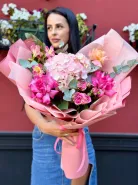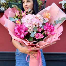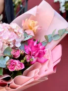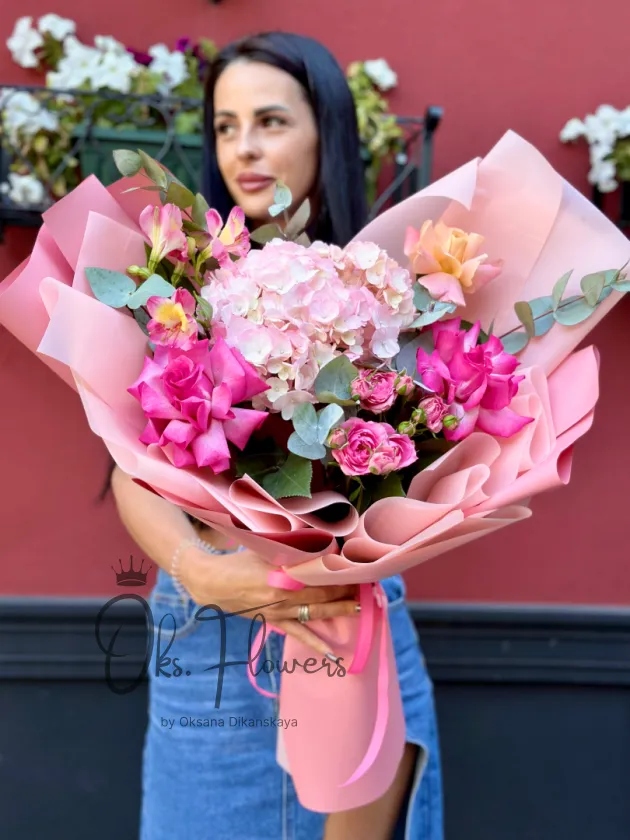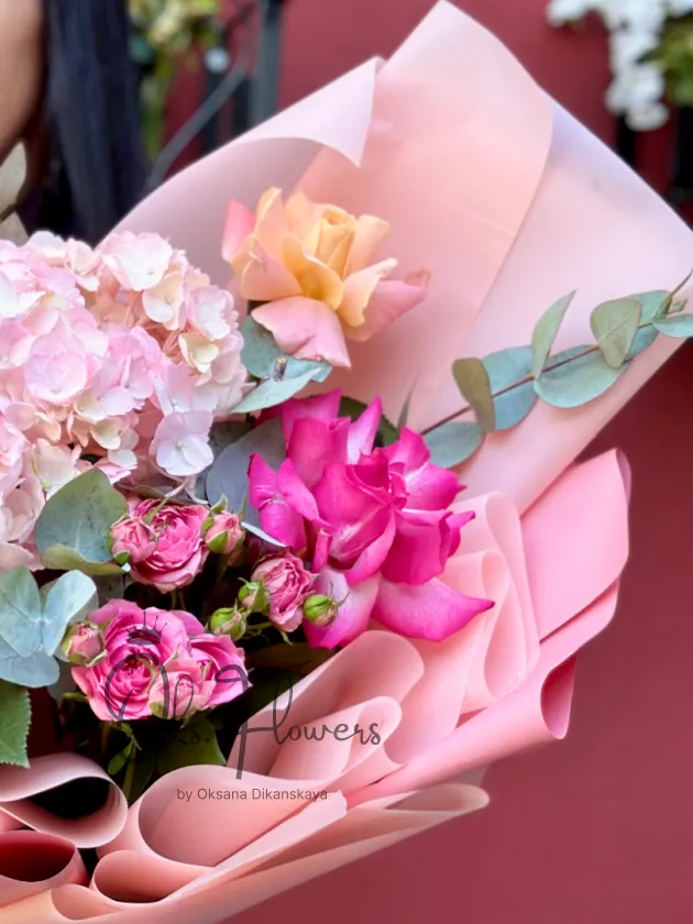 Это нежный, пышный и страстный букет из ярких розовых роз, нежной гортензии и свежего эвкалипта — словно сад, взорвавшийся от радости. Упакованный в пастельную бумагу — идеален для тех, кто ценит женственность, эмоции и цветную поэзию.