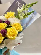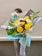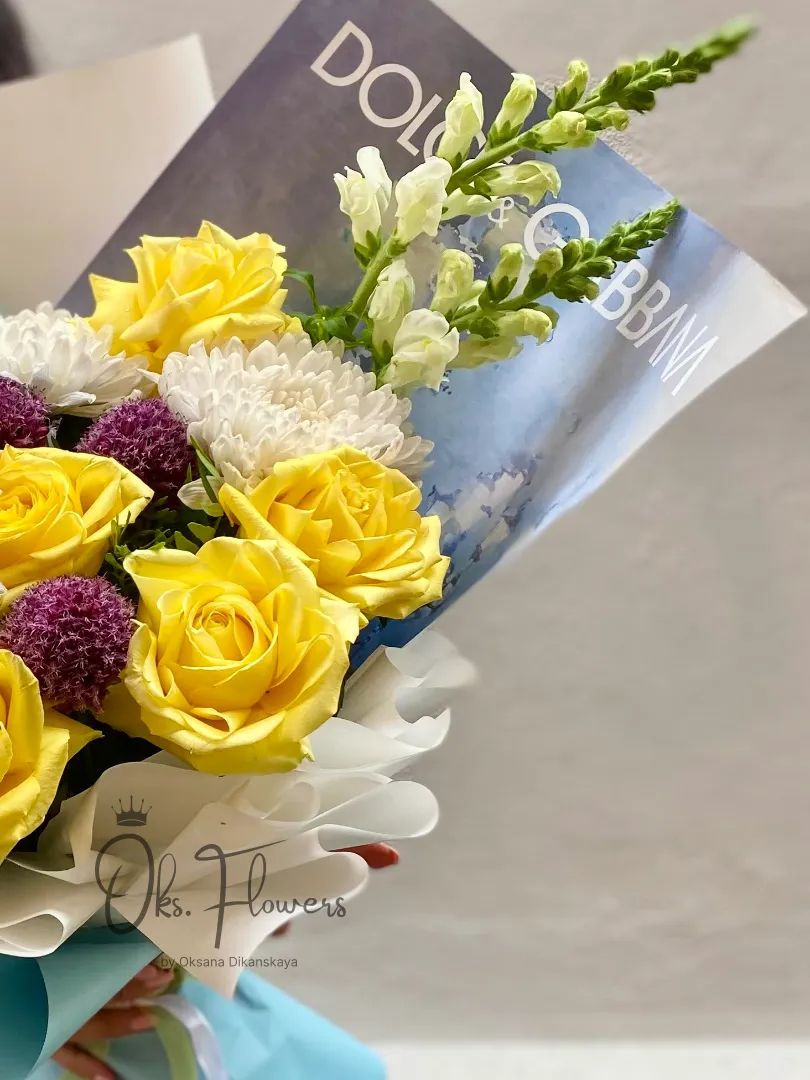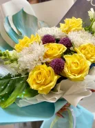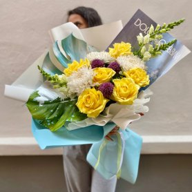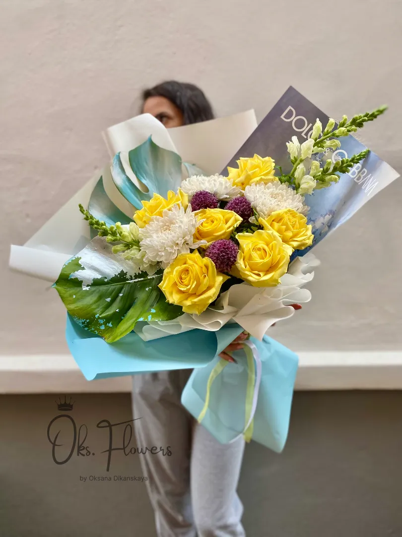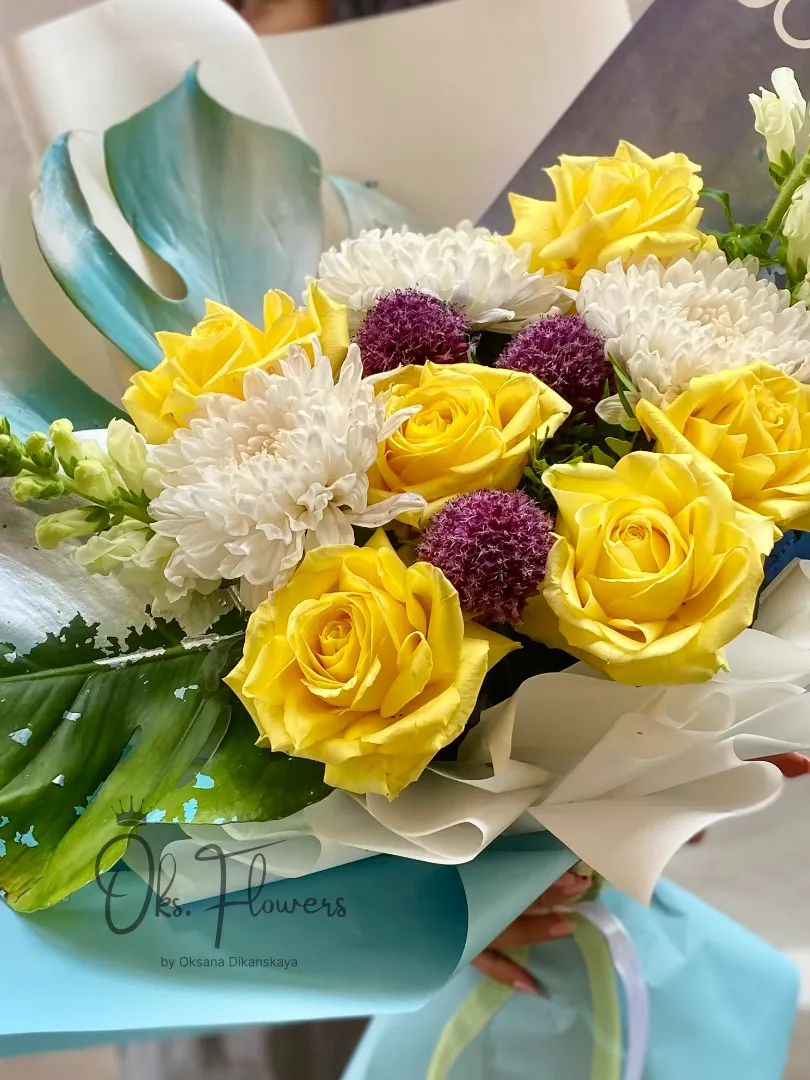 Это яркий, жизнерадостный и тёплый букет из насыщенных жёлтых роз, белых хризантем и тропических листьев — словно солнце улыбнулось вам в руках. Упакованный в мятную бумагу — идеален для тех, кто ценит свет, энергию и безупречный стиль.