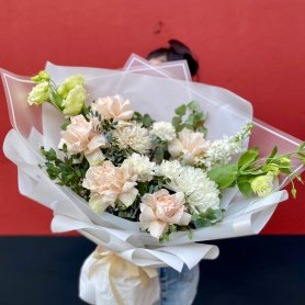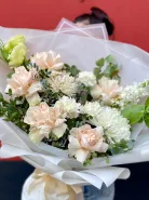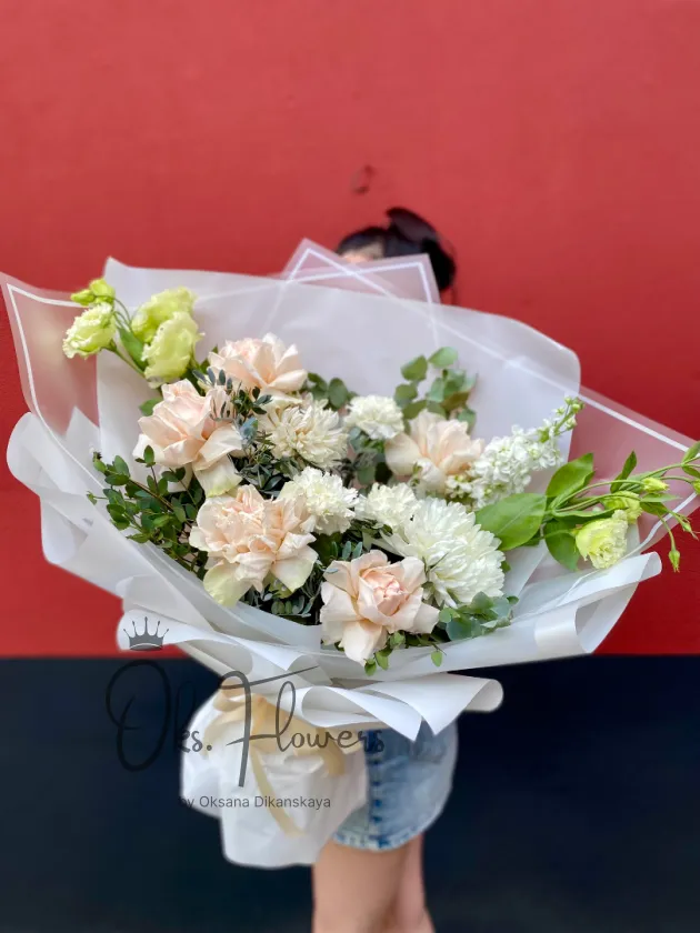 Это нежный, утончённый и спокойный букет из персиковых роз, белых хризантем и свежего эвкалипта — словно тихий вечер в саду. Упакованный в белую бумагу — идеален для тех, кто ценит чистоту, уют и доброту.