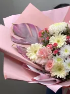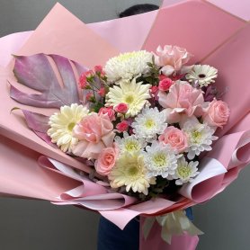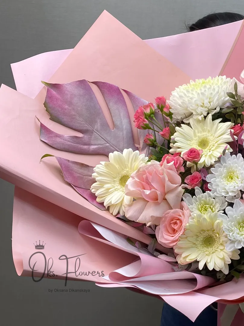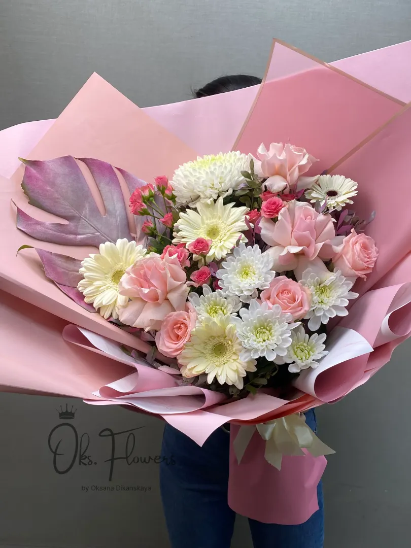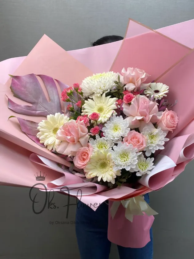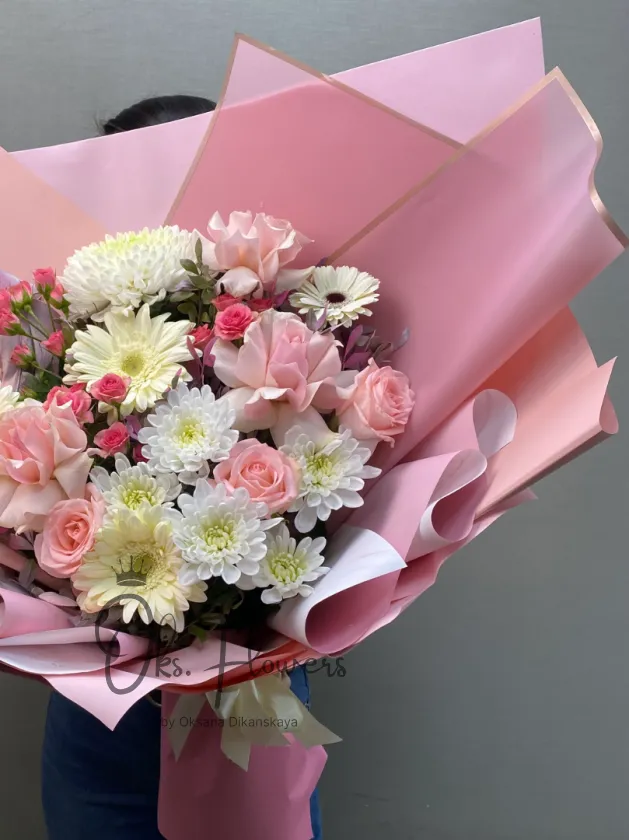 Это нежный, пышный и воздушный букет из розовых роз, белых ромашек и гербер — словно сны, упакованные в подарок. Упакованный в пастельную бумагу — идеален для тех, кто ценит женственность, свежесть и тихую радость.