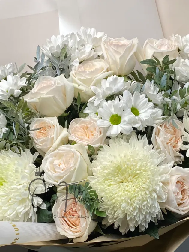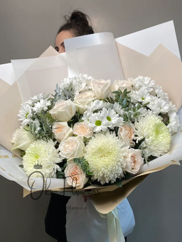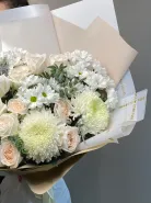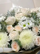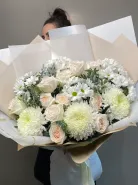 Это свежий, чистый и нежный букет из белоснежных хризантем и роз — словно бескрайний луг под ясным небом. Упакованный в пастельную бумагу — идеален для тех, кто ценит простоту, спокойствие и естественную красоту.