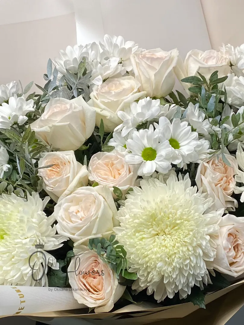 Это свежий, чистый и нежный букет из белоснежных хризантем и роз — словно бескрайний луг под ясным небом. Упакованный в пастельную бумагу — идеален для тех, кто ценит простоту, спокойствие и естественную красоту.