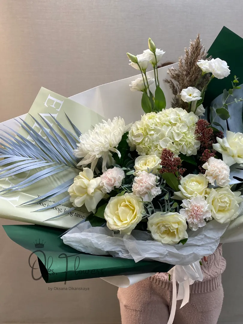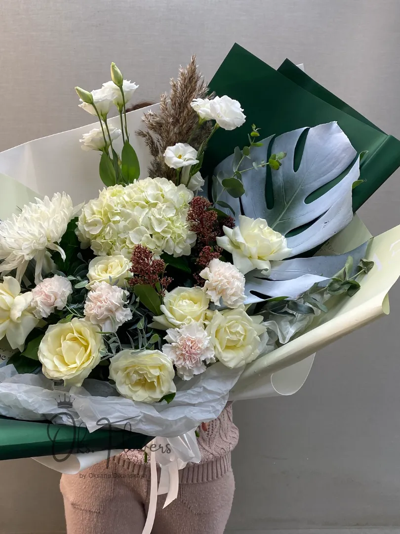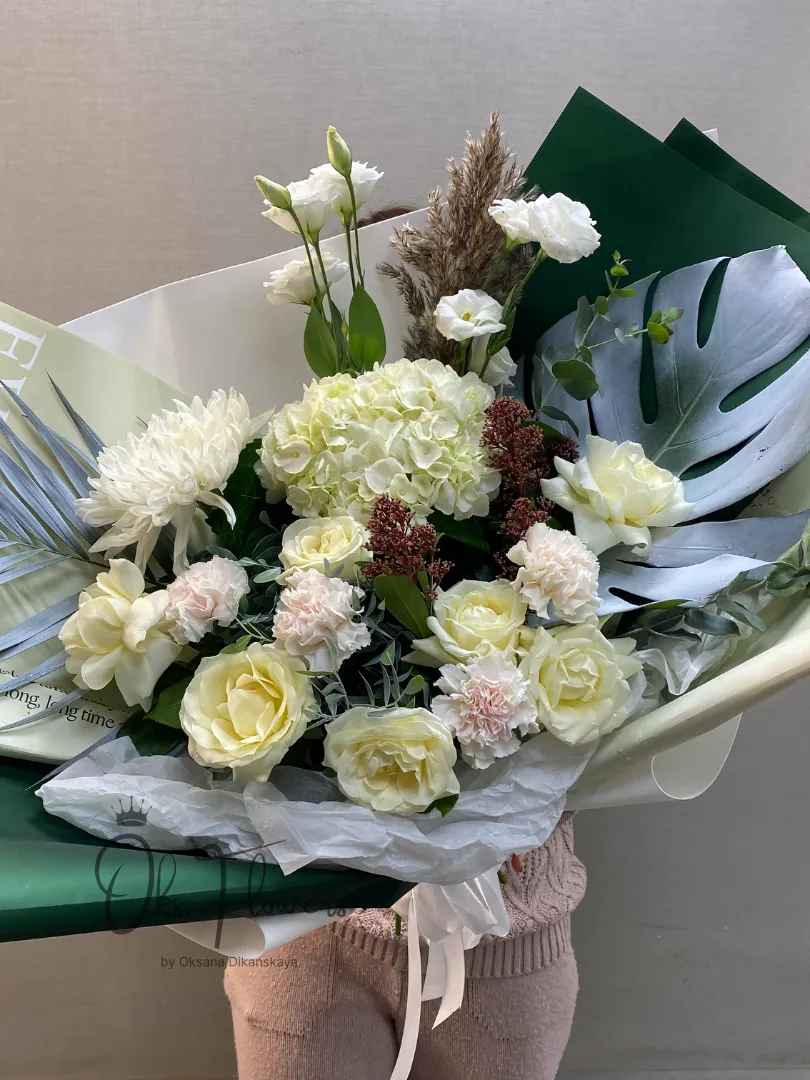 Это свежий, воздушный и умиротворяющий букет из белых роз, белых хризантем и тропических листьев — словно прогулка по дождевому лесу. Упакованный в зелёную бумагу — идеален для тех, кто ценит природную гармонию и спокойствие.