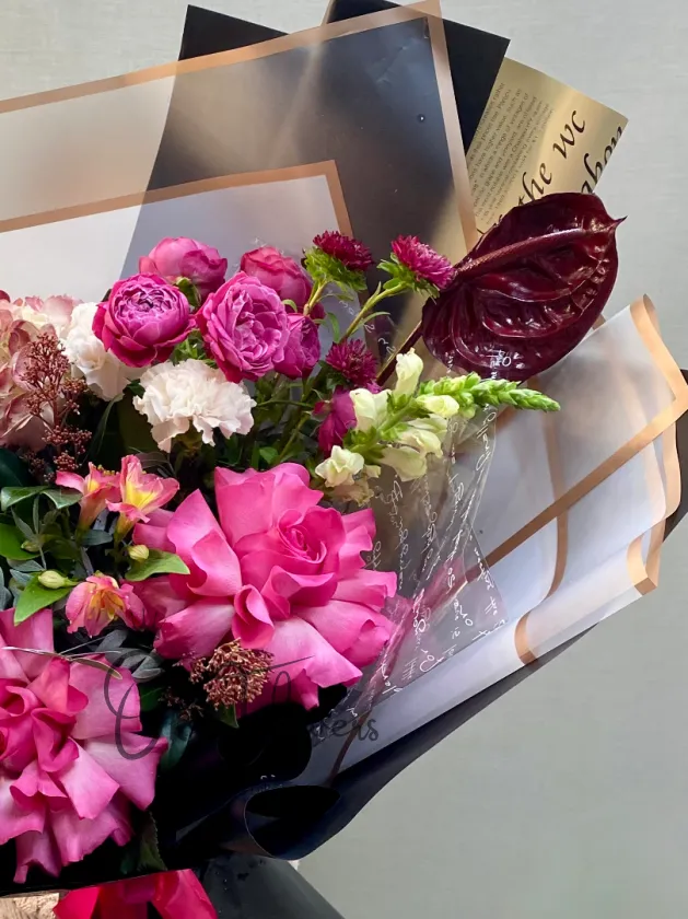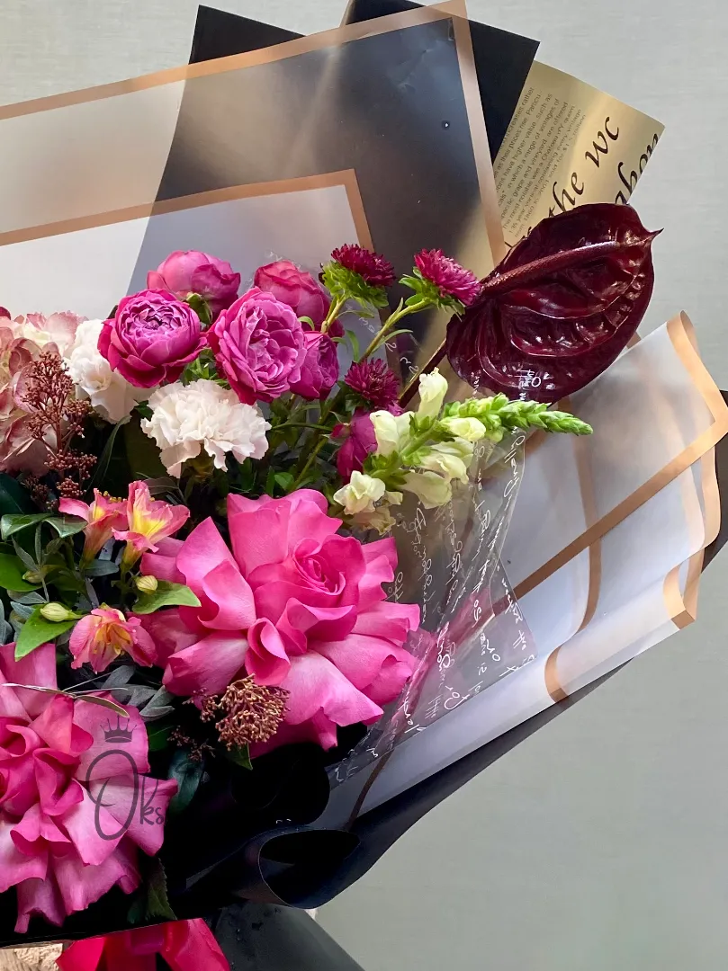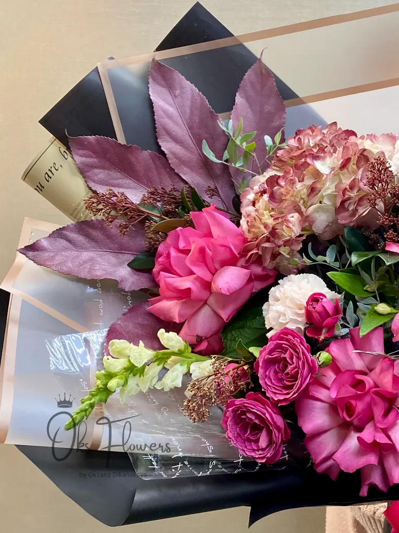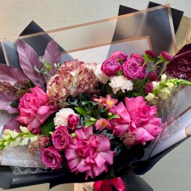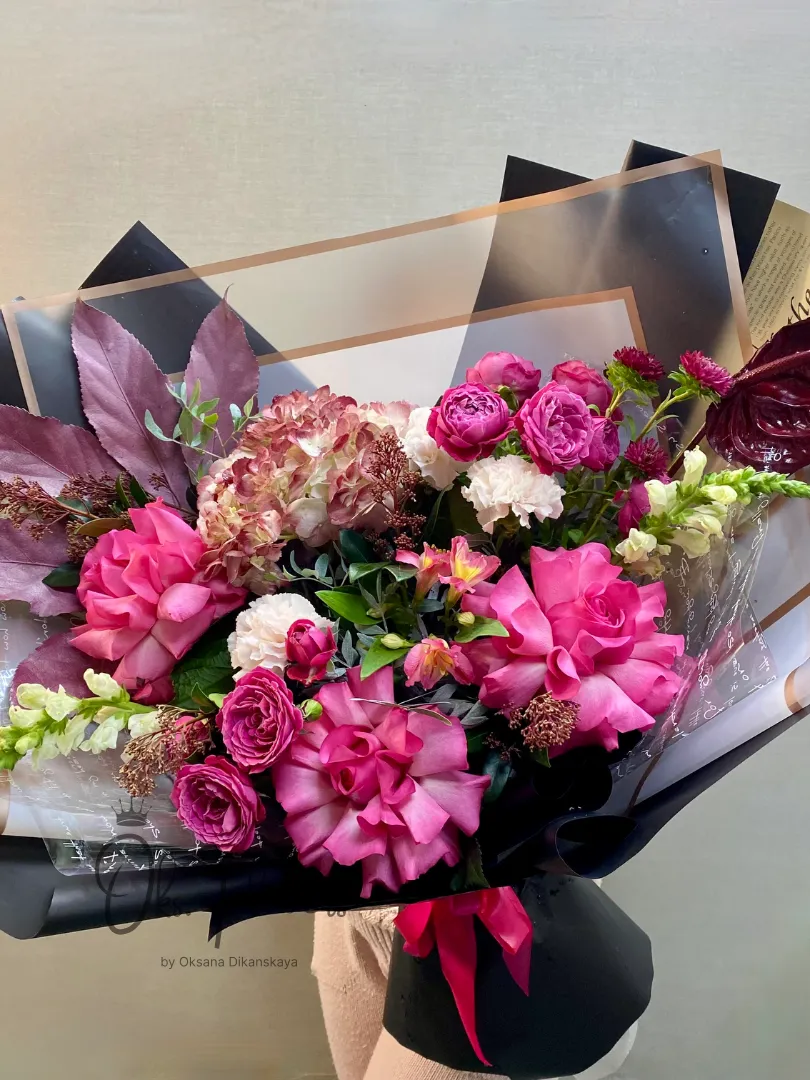 Это загадочный, глубокий и роскошный букет из малиновых роз, фиолетовых акцентов и декоративных листьев — словно тайна, раскрывающаяся в каждом лепестке. Упакованный в чёрную бумагу — идеален для тех, кто ценит изысканность и силу чувств.