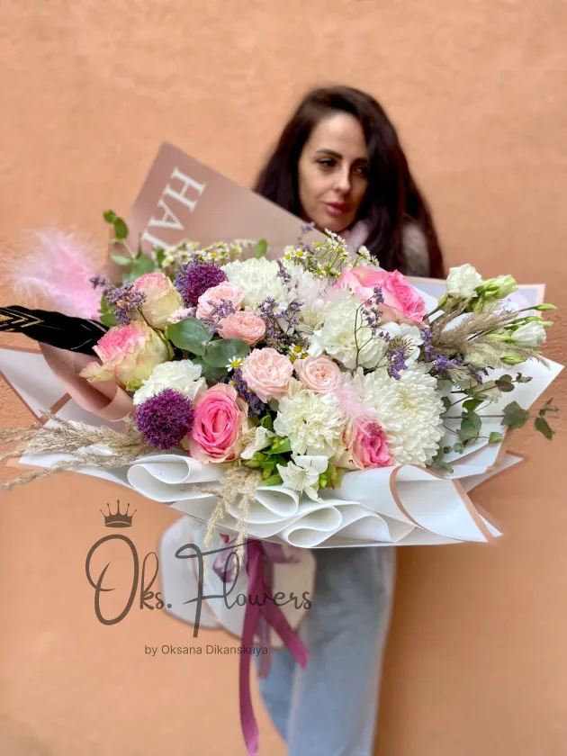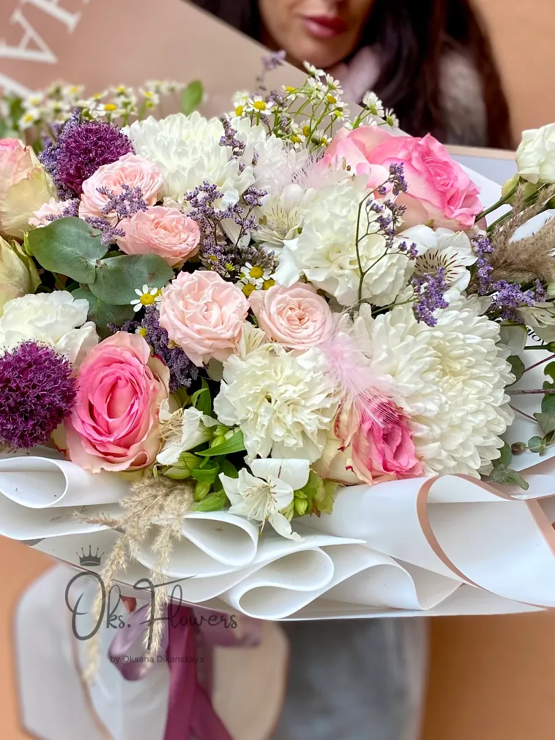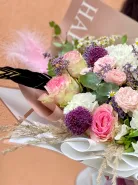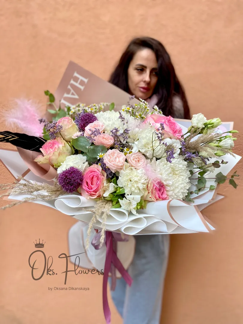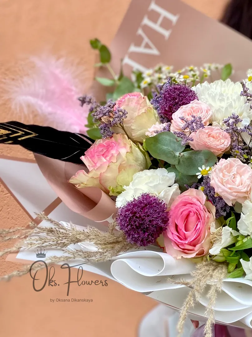 Это воздушный, многослойный и эмоциональный букет , дополненный пампасной травой и перьями — словно вихрь радости, остановившийся в ваших руках. Упакованный в белую бумагу — идеален для тех, кто ценит изысканность, праздничное настроение и женственность.