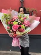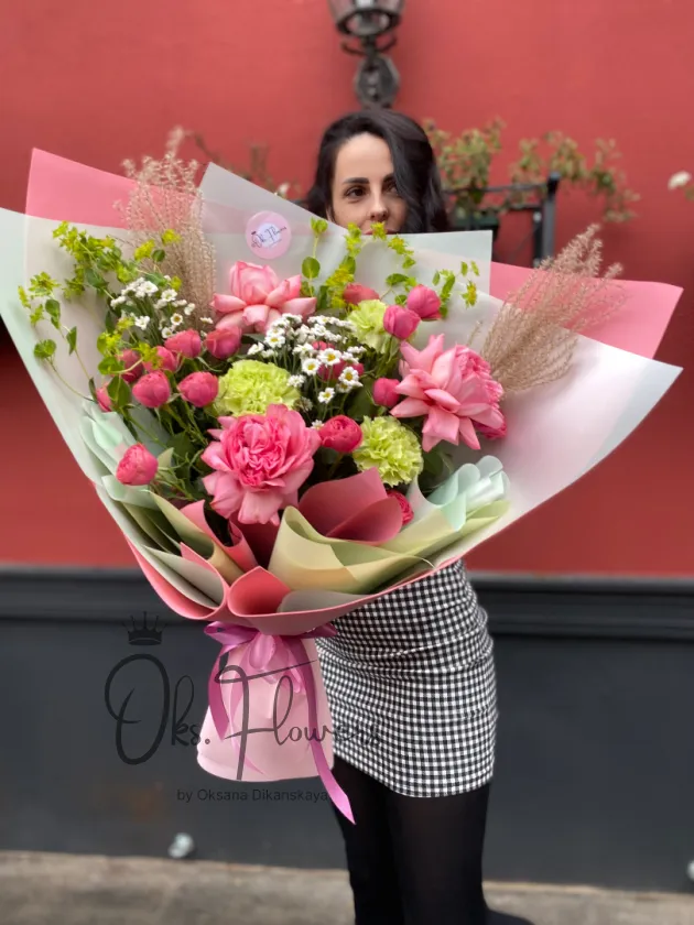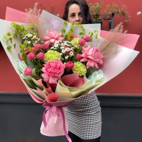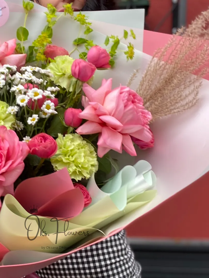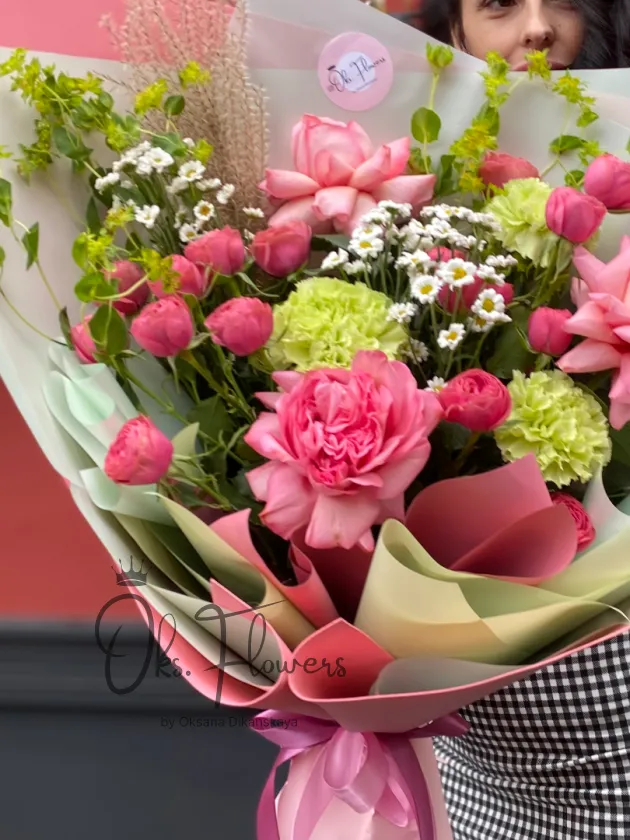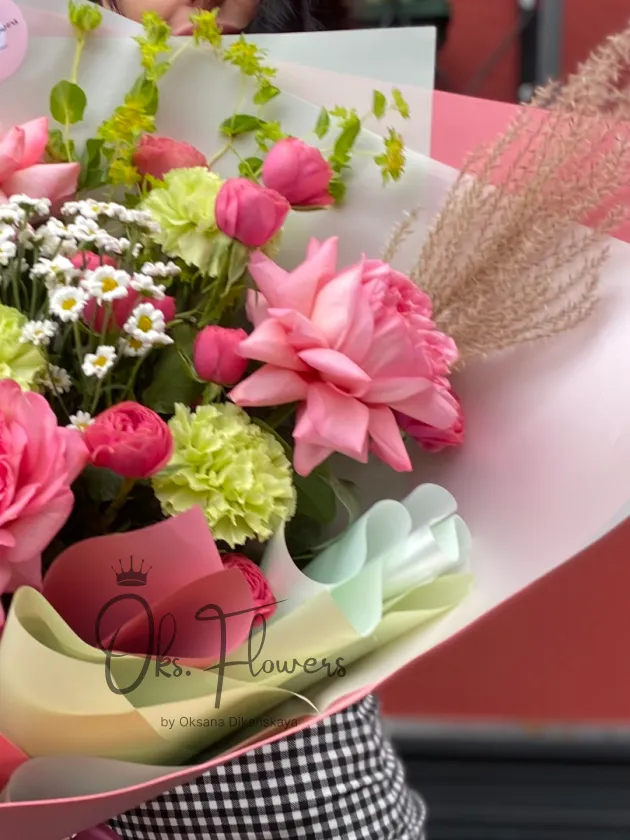 Это яркий, воздушный и эмоциональный букет из розовых роз, зелёных хризантем и декоративных элементов — словно праздничный салют из цветов. Упакованный в пастельную бумагу — идеален для тех, кто ценит радость, женственность и цветную поэзию.