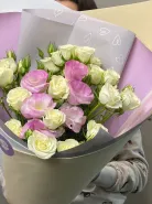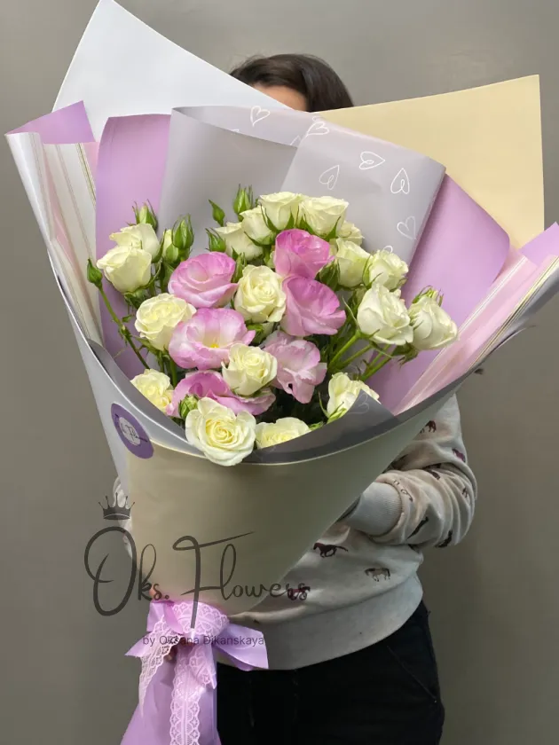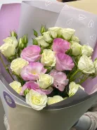 Лёгкий и воздушный букет с белыми и сиренево-розовыми эустомами в стильной упаковке. Сочетание пастельных тонов создаёт ощущение уюта и заботы — идеальный подарок для выражения благодарности, внимания или любви.