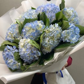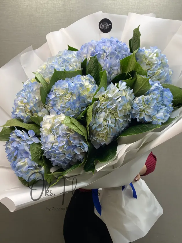 Это спокойный, утончённый и свежий букет из голубых гортензий — словно дуновение морского ветра. Упакованный в белую бумагу — идеален для тех, кто ценит чистоту, гармонию и природную красоту.