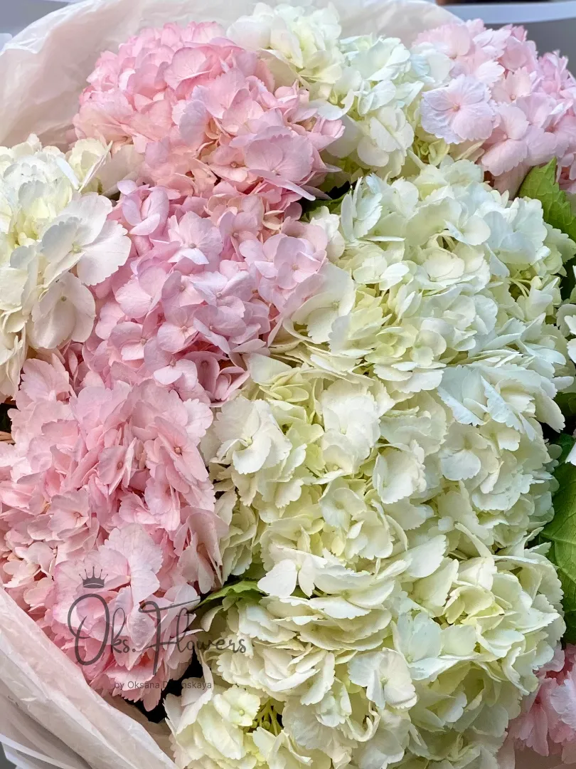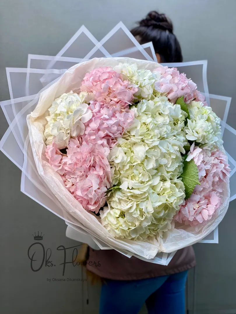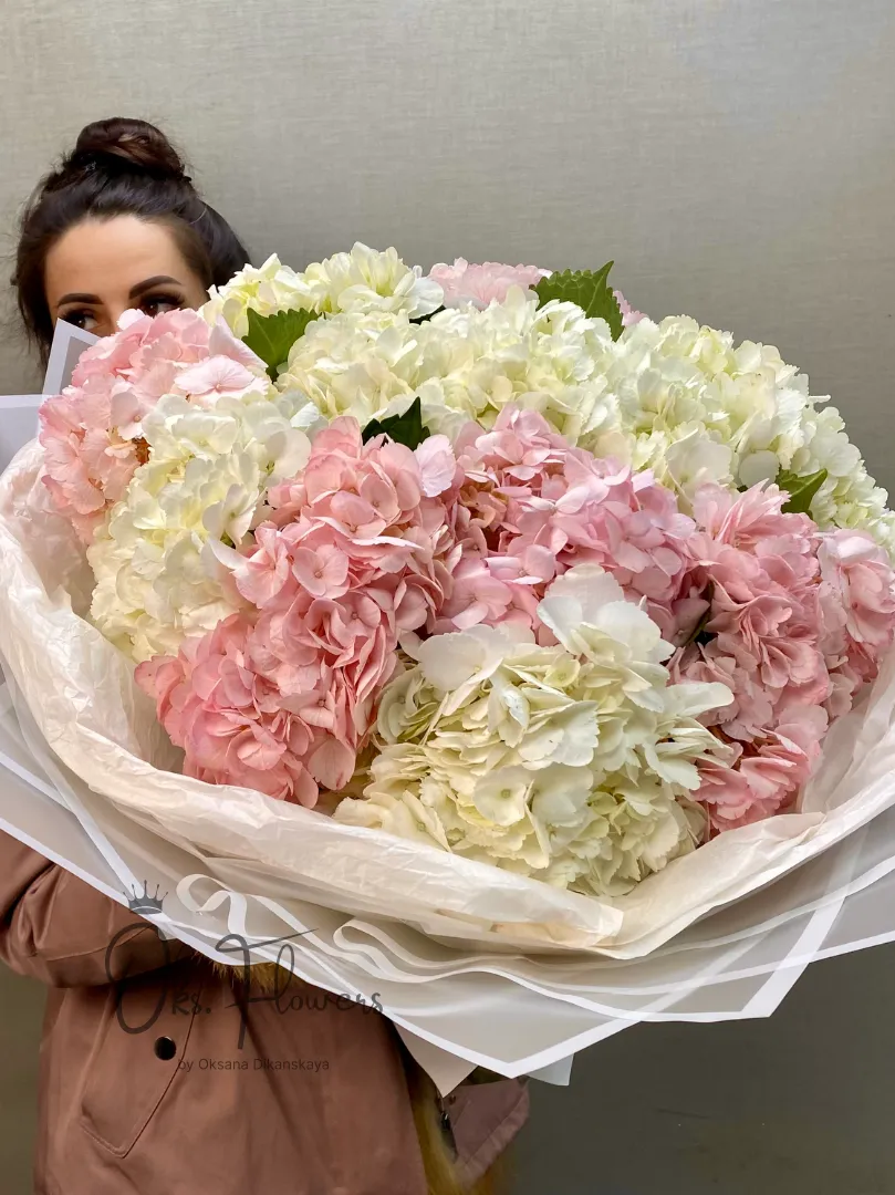 Это воздушный, нежный и пышный букет из розовых и кремовых гортензий — словно облако, усыпанное цветами. Упакованный в матовую бумагу — идеален для тех, кто ценит спокойствие, элегантность и природную красоту.