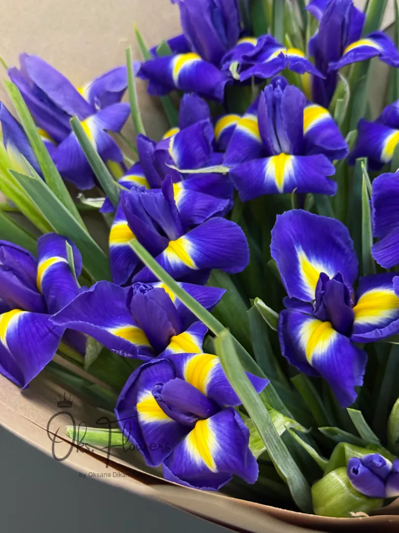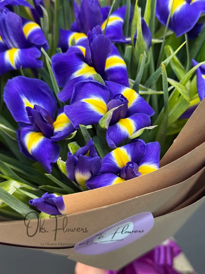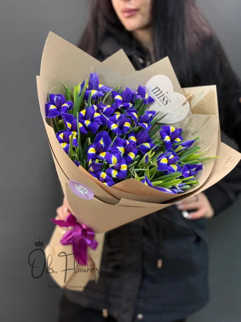 Это монохромная поэзия из изящных ирисов, словно сошедших с полотен импрессионистов — с их бархатистыми лепестками и тонким ароматом весны. Упакованные в натуральную крафт бумагу, они выглядят одновременно скромно и благородно, подчёркивая вкус того, кто дарит и того, кто получает.