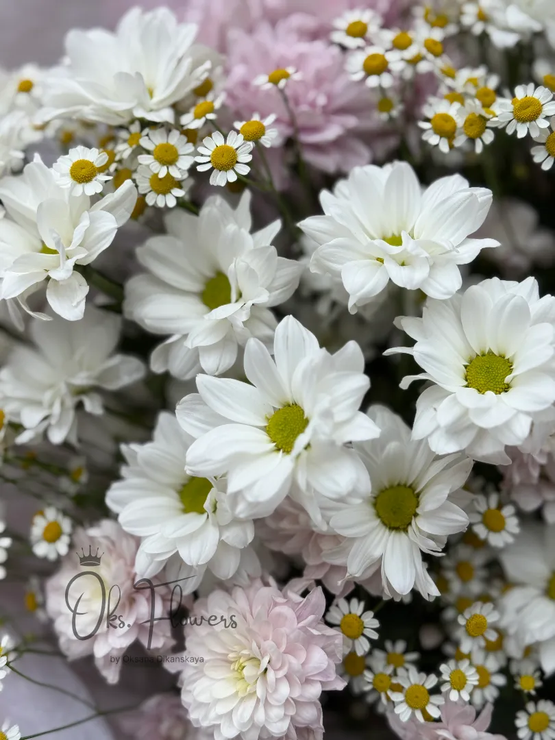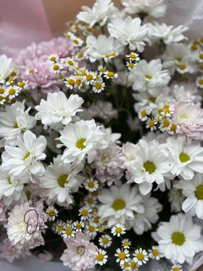 Подарите близкому человеку не просто букет — а «Луговой Ветерок». Это композиция, созданная для тех, кто ценит простоту, чистоту и естественную красоту. Белоснежные ромашки, нежно-розовые хризантемы и мелкие цветы образуют гармоничный ансамбль, словно сотканный из солнечных лучей и утреннего прохладного воздуха. Дополняют композицию свежая зелень — придающие объём и текстуру.