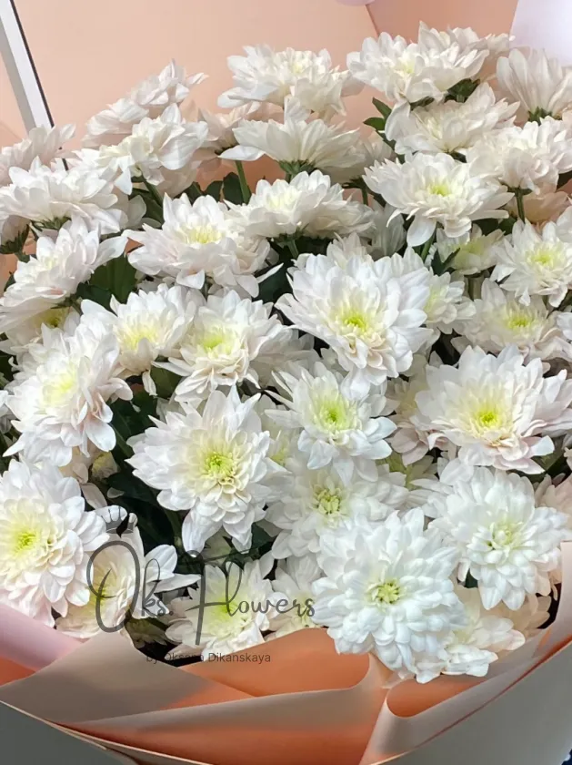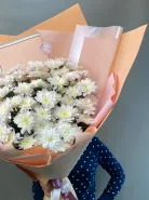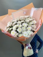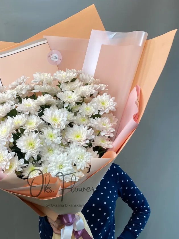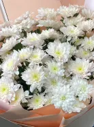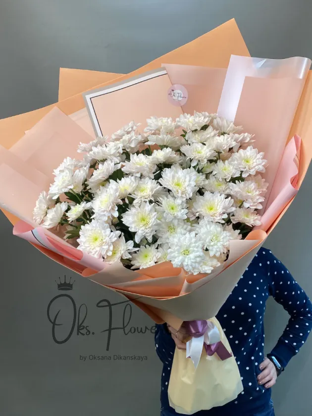 Большой букет из белых хризантем — символа искренности, верности и душевного тепла. Простой, но утончённый букет подойдёт для поздравления коллег, родных или просто в знак внимания. Упакован в стильную матовую бумагу персикового цвета, что подчёркивает чистоту белоснежных соцветий.