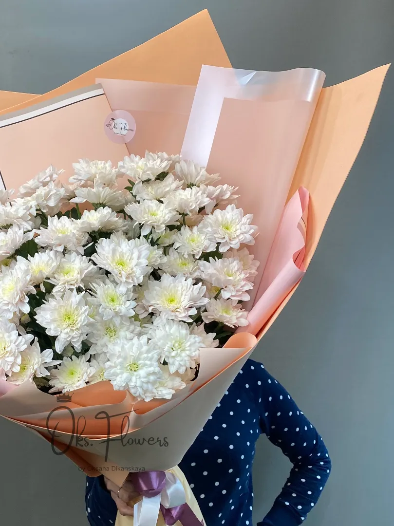 Большой букет из белых хризантем — символа искренности, верности и душевного тепла. Простой, но утончённый букет подойдёт для поздравления коллег, родных или просто в знак внимания. Упакован в стильную матовую бумагу персикового цвета, что подчёркивает чистоту белоснежных соцветий.