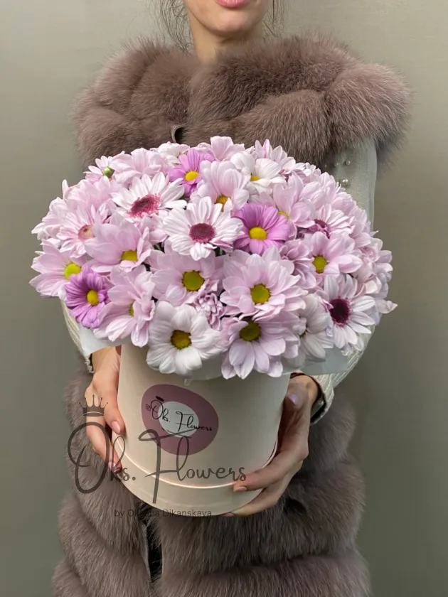 Нежная цветочная коробка с хризантемами пастельно-лавандового оттенка. Дарит ощущение лёгкости, тепла и заботы. Идеальный подарок для мамы, подруги или коллеги — универсальный и душевный вариант на любой праздник.