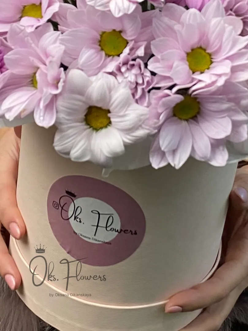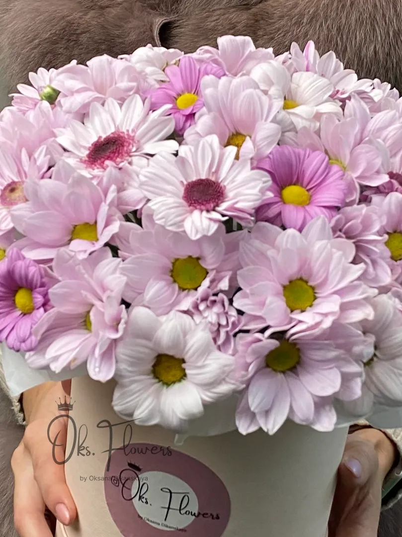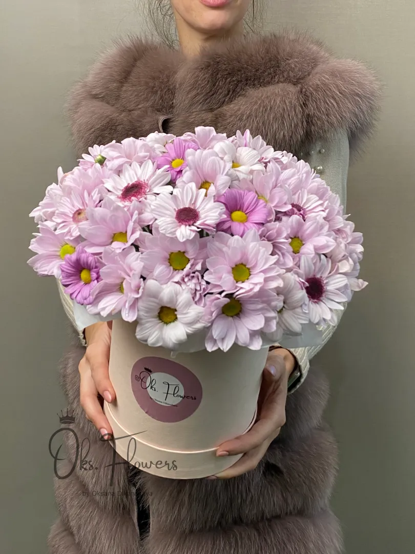 Нежная цветочная коробка с хризантемами пастельно-лавандового оттенка. Дарит ощущение лёгкости, тепла и заботы. Идеальный подарок для мамы, подруги или коллеги — универсальный и душевный вариант на любой праздник.