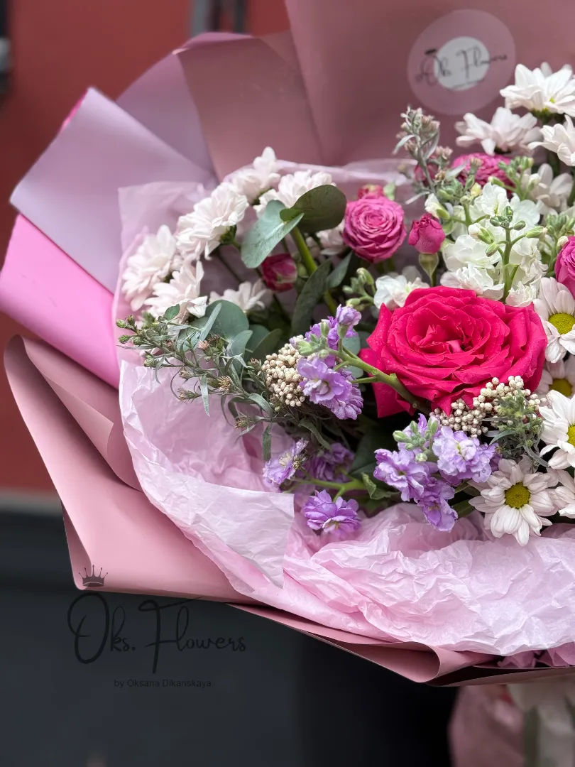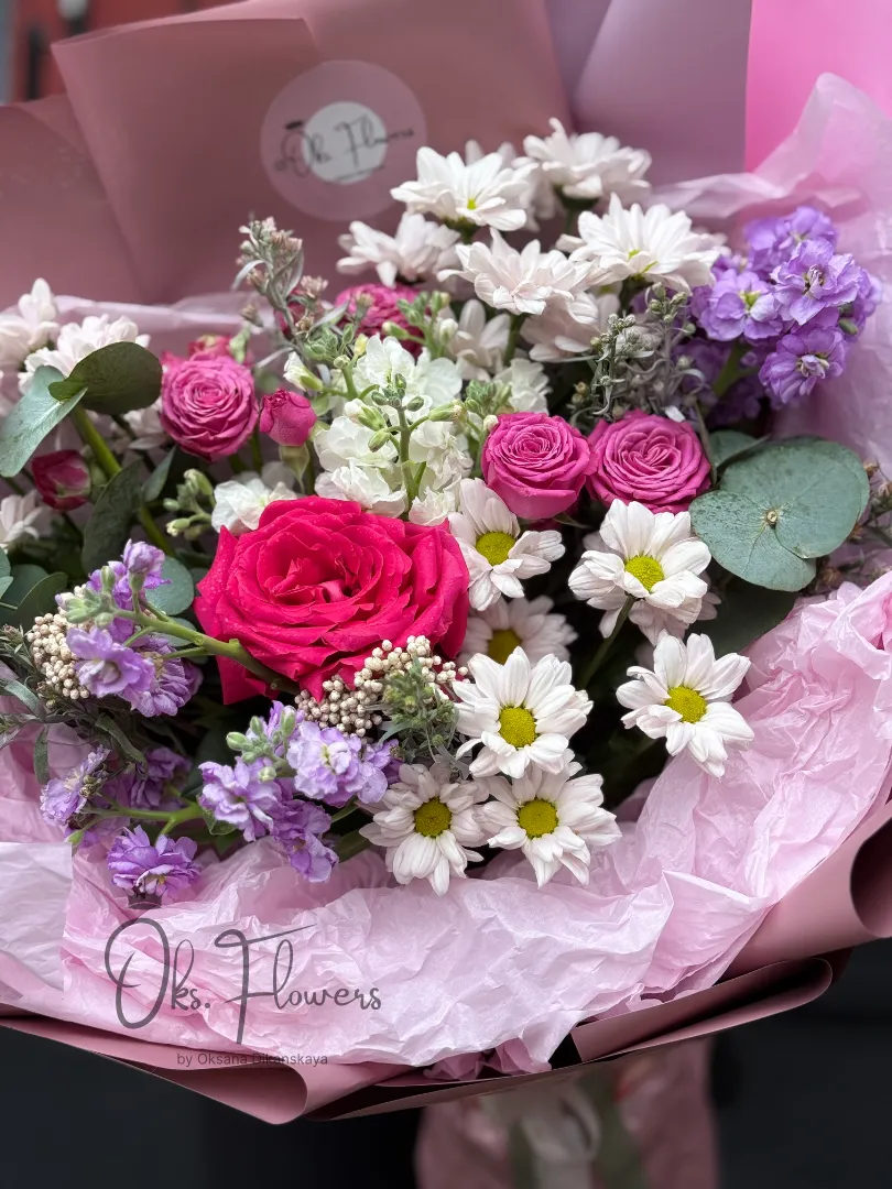 Подарите близкому человеку не просто букет — а «Розовый Фантазер». Этот букет создан для тех, кто ценит изысканность, яркость и эмоциональную глубину. Крупные насыщенно-розовые розы, нежно-розовые пионовидные розы, белые хризантемы и фиолетовые матиолла образуют гармоничный ансамбль, словно сотканный из закатных лучей и вечернего прохладного воздуха. Дополняют композицию свежий эвкалипт — придающие объём, текстуру и природную свежесть.