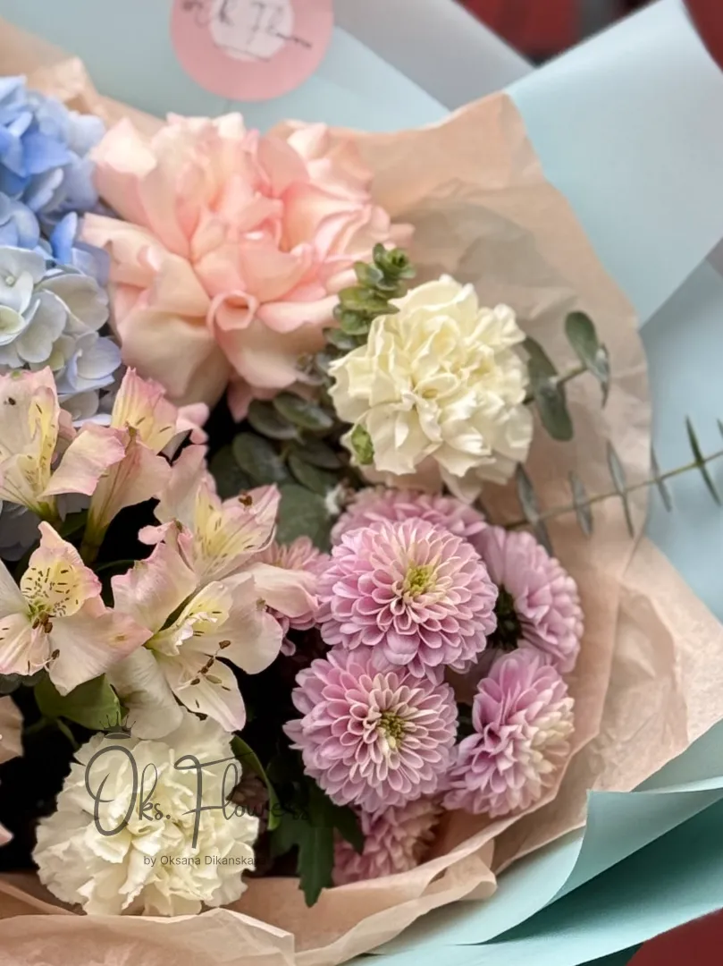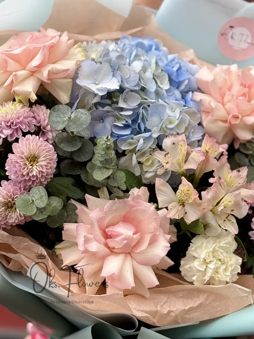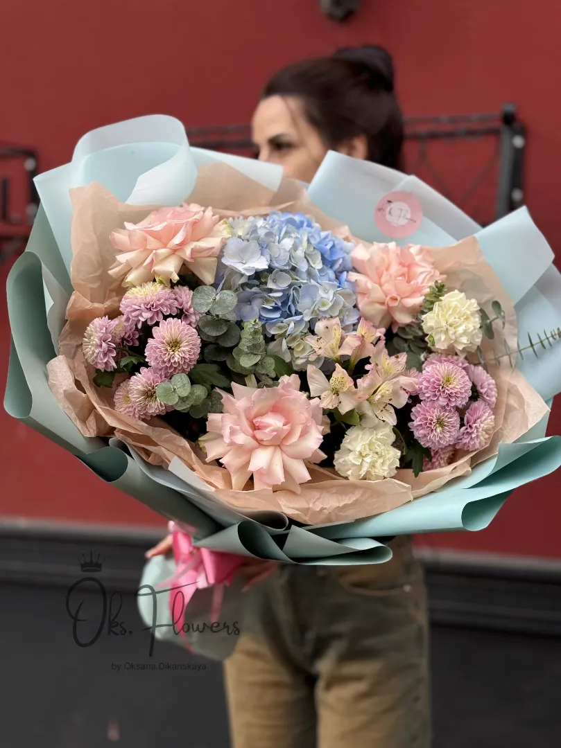 Подарите близкому человеку не просто букет — а «Небесную Нежность». Это композиция, словно сошедшая с облаков: пастельно-голубые гортензии, нежно-розовые розы и воздушные хризантемы создают ощущение уюта, чистоты и безмятежной красоты. Упакованная в лёгкую мятную бумагу с розовой лентой, она идеально подойдёт для тех, кто умеет видеть вдохновение в каждом моменте.