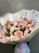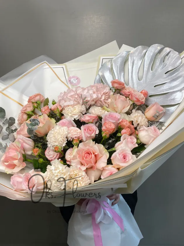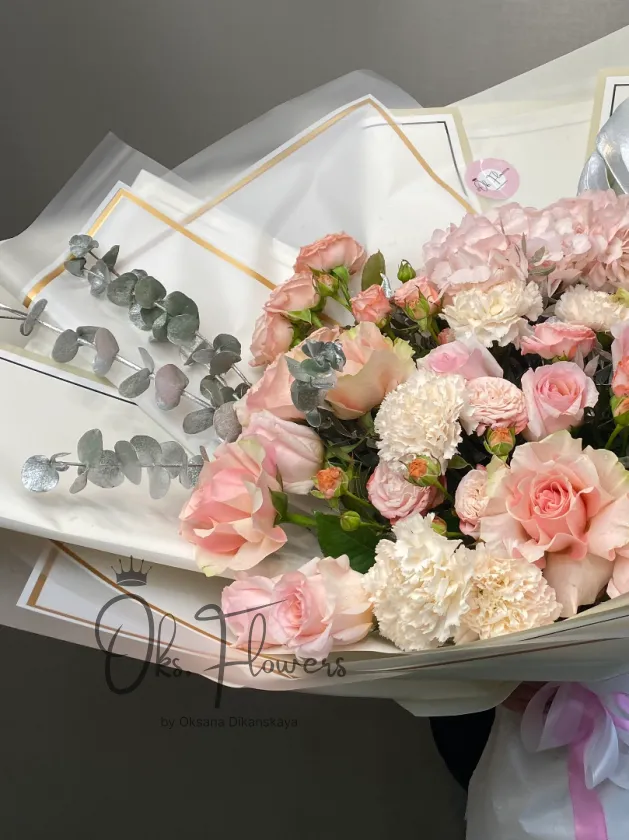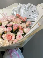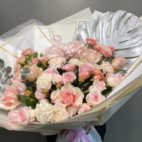 Нежные розы, гвоздики и эустома оттенены серебристыми листьями и стильной упаковкой. Идеален для дня рождения, признания в любви или просто чтобы сказать “спасибо”. Купить букет в Нижнем Новгороде с доставкой — просто и удобно.