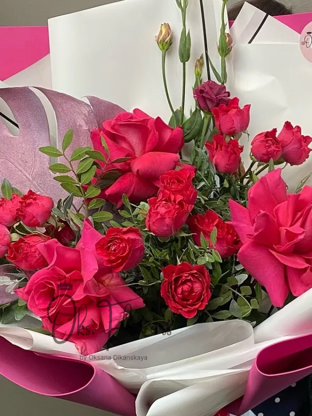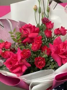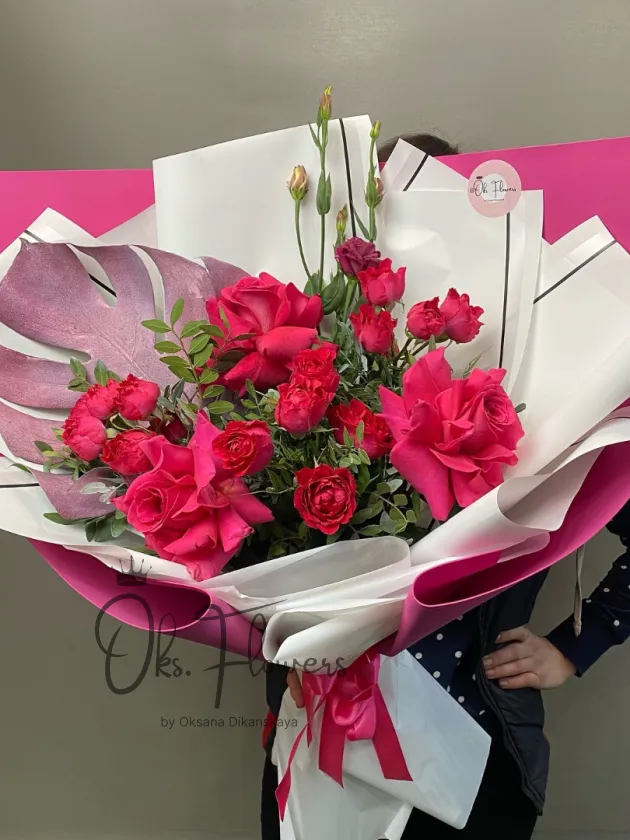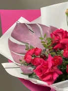 Яркий и выразительный букет в бело-розовой гамме. Сочетание насыщенных розовых роз и кустовых роз, дополненных эустомой и декоративной зеленью, создаёт атмосферу радости и тепла. Великолепный выбор для признания в любви или поздравления любимой.