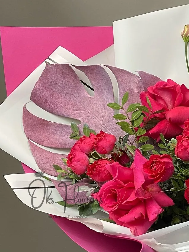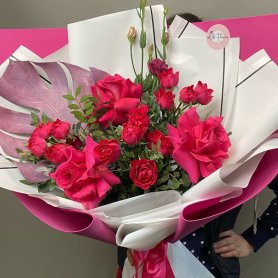 Яркий и выразительный букет в бело-розовой гамме. Сочетание насыщенных розовых роз и кустовых роз, дополненных эустомой и декоративной зеленью, создаёт атмосферу радости и тепла. Великолепный выбор для признания в любви или поздравления любимой.
