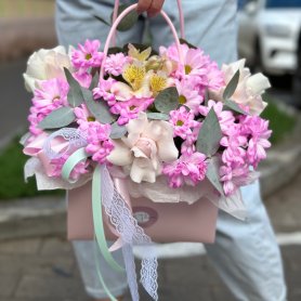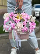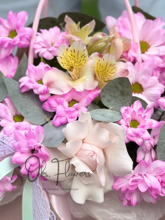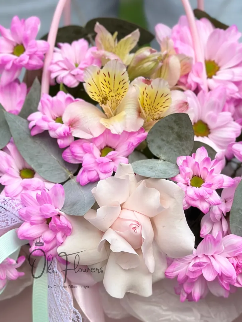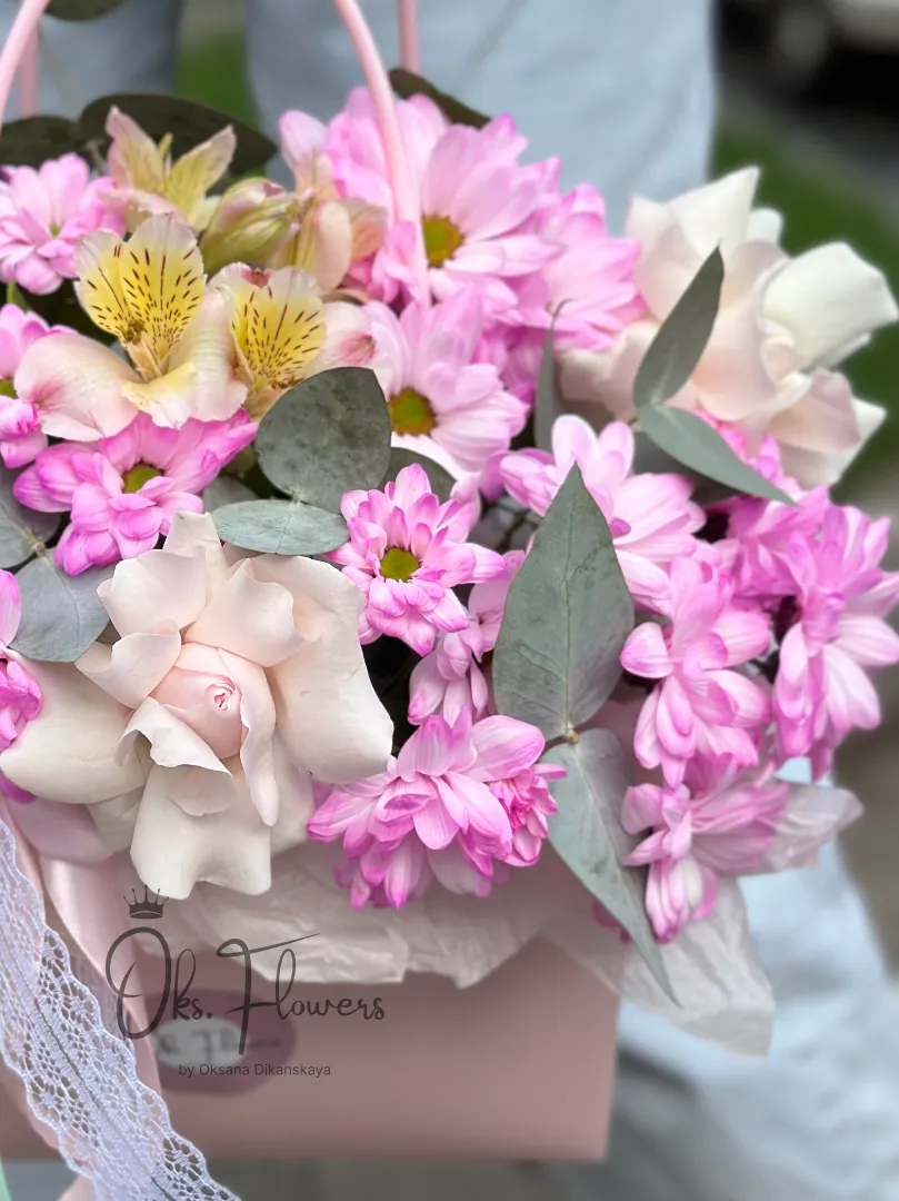 Это воздушная, нежная композиция, где пастельные розы, яркие хризантемы и изящные альстромерии создают ощущение весеннего сада, упакованного в подарок. Упакованная в стильную розовую коробку с ручкой и украшенная кружевной лентой — она идеальна для тех, кто ценит романтику, свежесть и женственность.