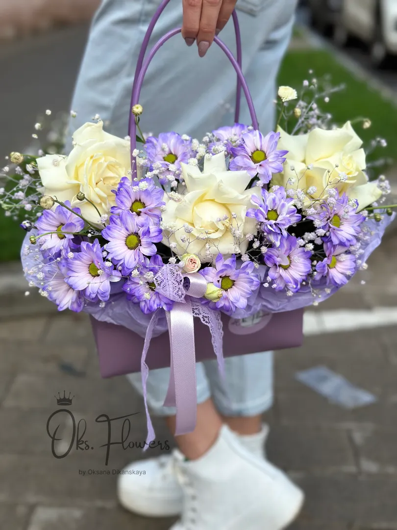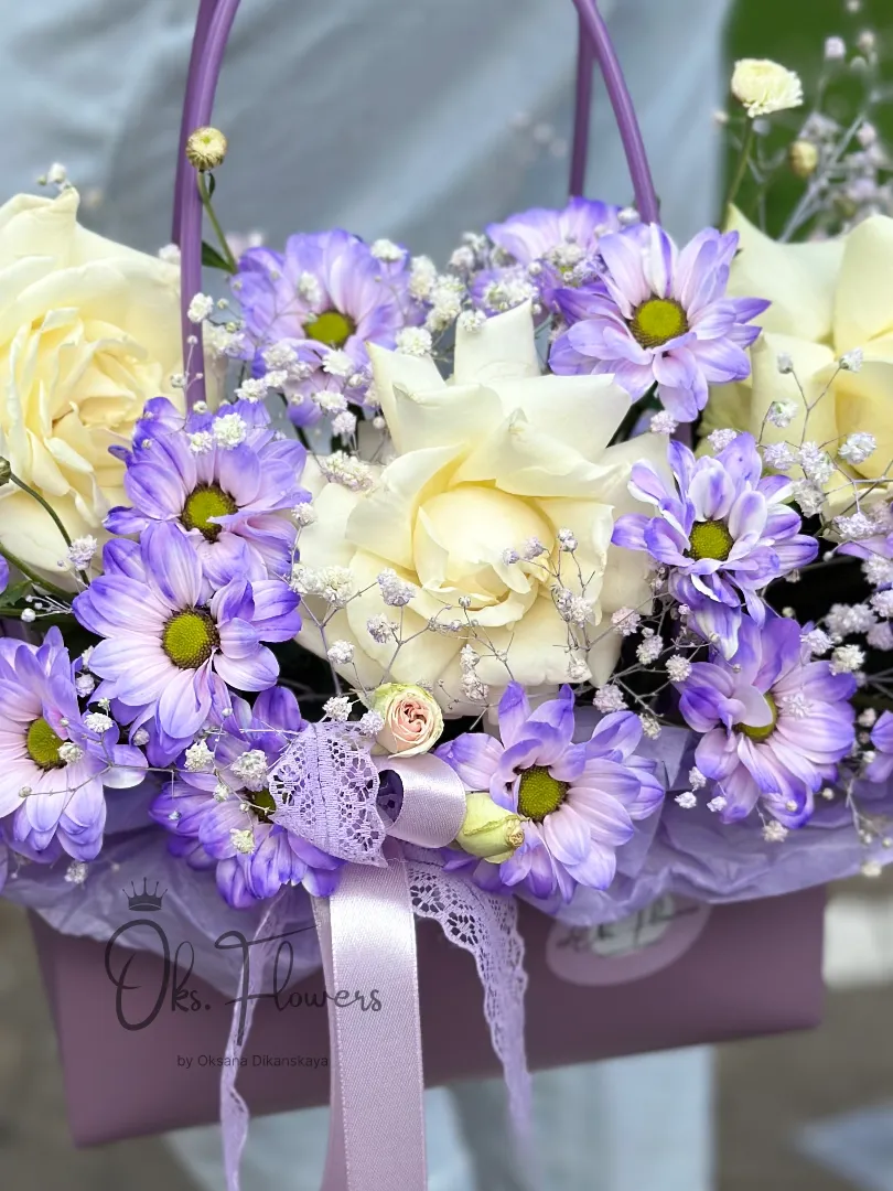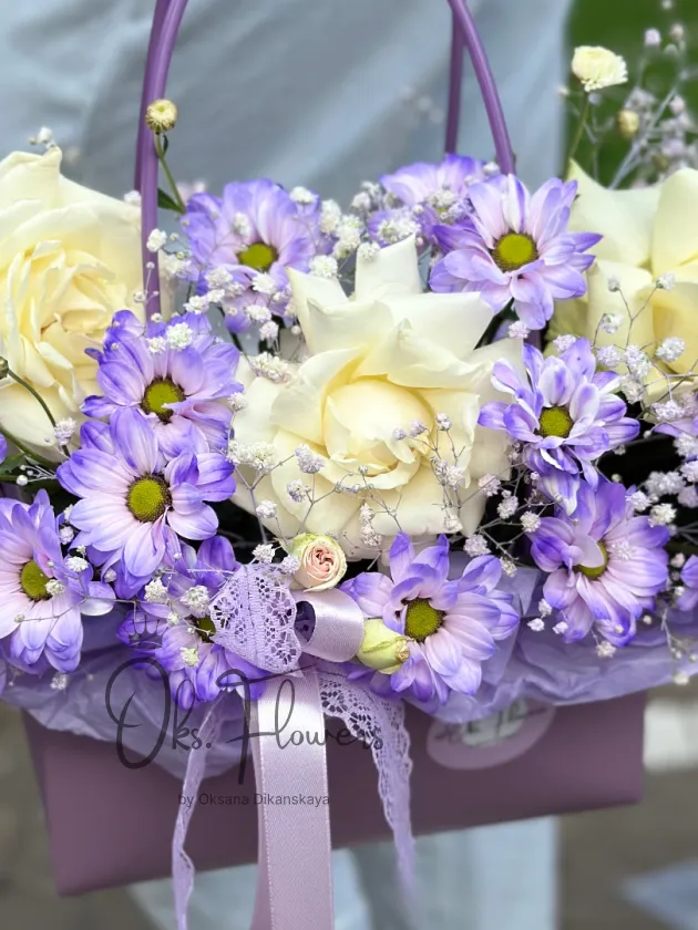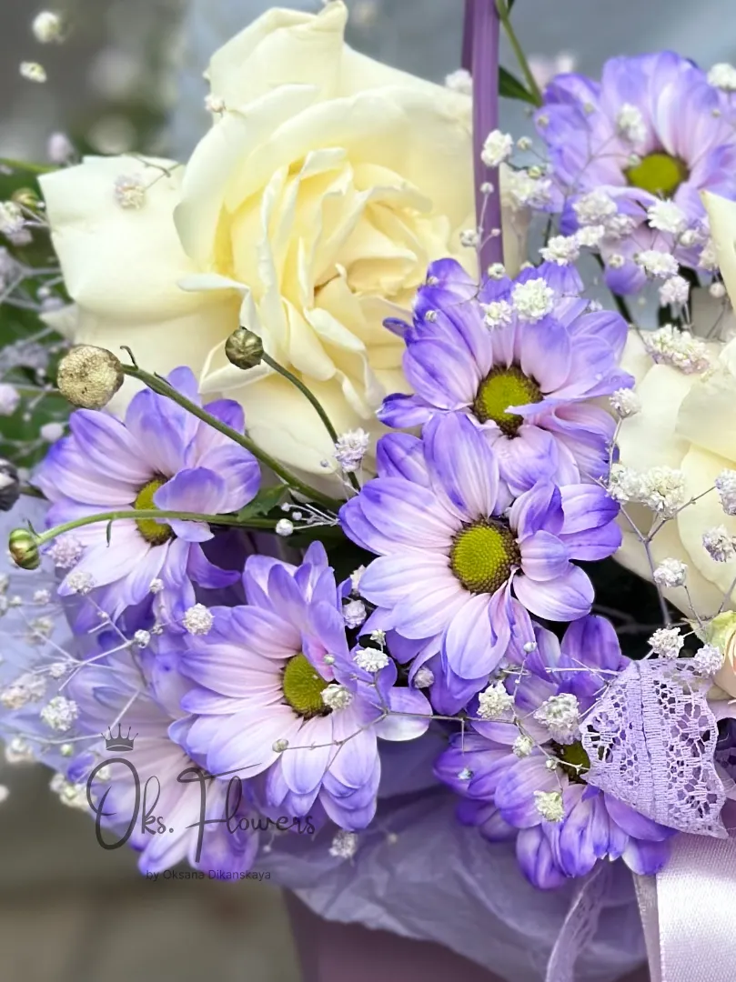 Это нежная, свежая композиция, где белые розы мягко переплетаются с фиолетовыми хризантемами и воздушной гипсофилой — словно первый свет дня, усыпанный цветами. Упакованная в матовую фиолетовую коробку с лентой — она идеальна для тех, кто ценит спокойствие, изысканность и тихую красоту.