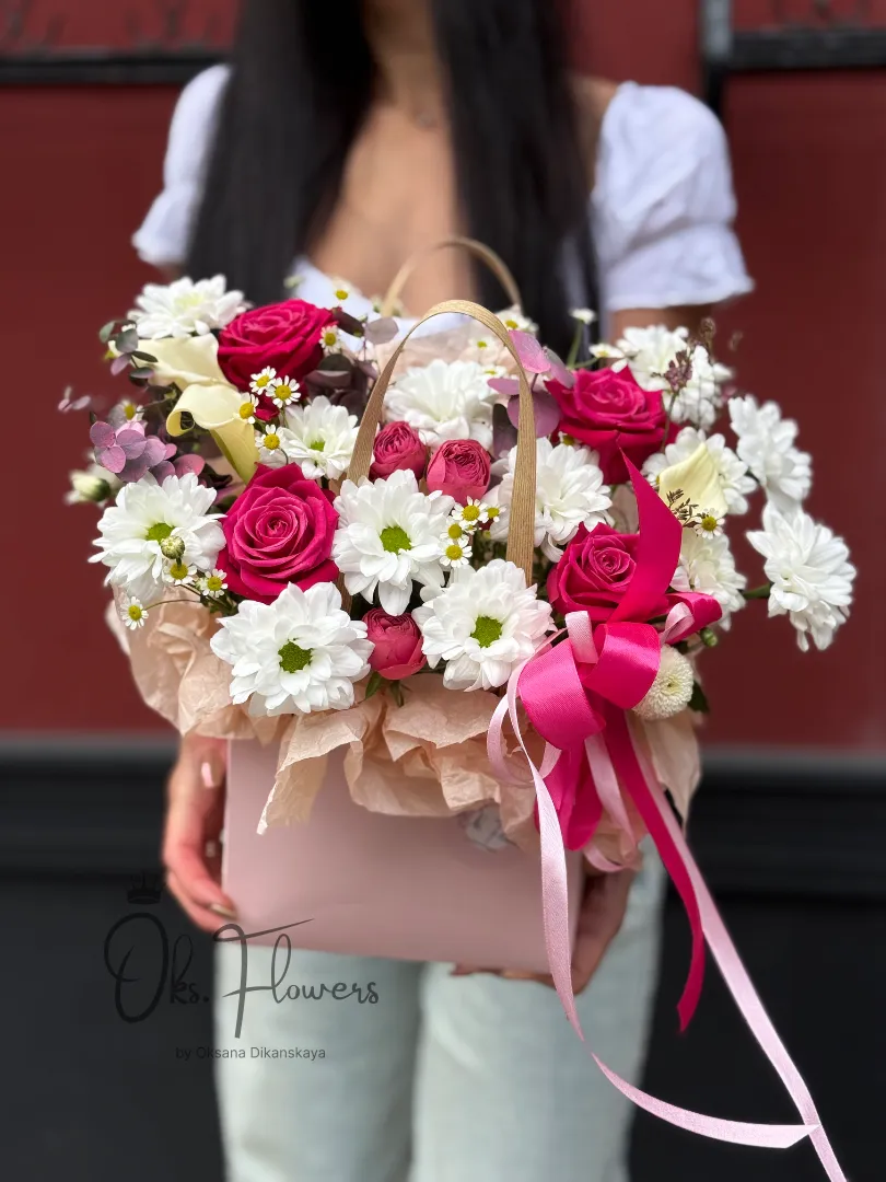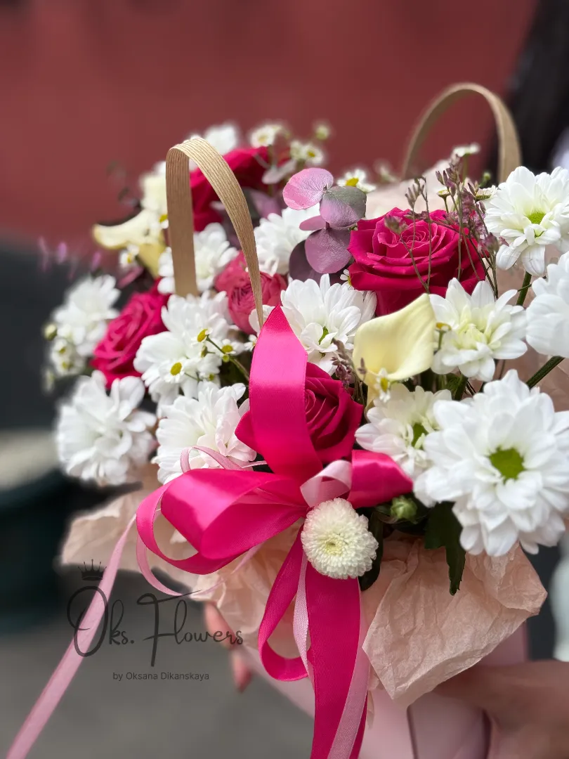 Пусть каждый взгляд, встречающий этот букет, остановится от восхищения — «Розовый Восторг» создан для тех, кто ценит смелость, элегантность и нежную роскошь. Глубокие бордово-розовые розы гармонично сочетаются с белоснежными хризантемами, каллами и ромашками, а акцентные веточки сухоцветов и пастельная гортензия добавляют композиции глубины и утончённости.