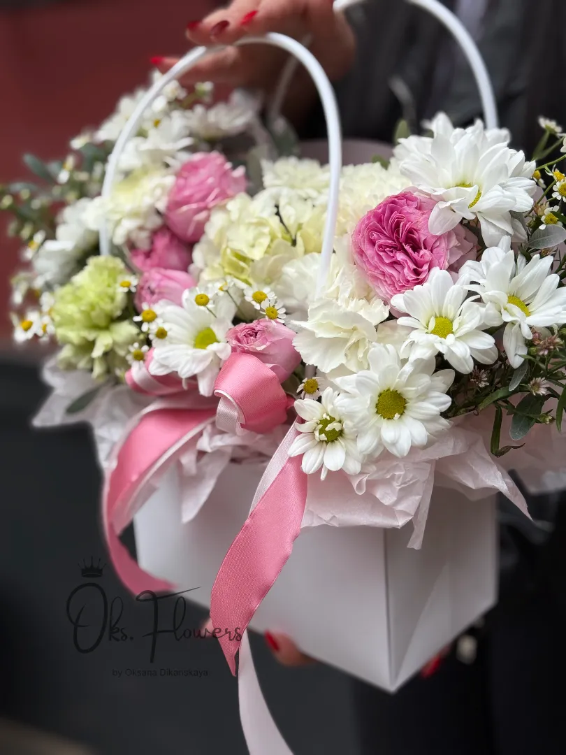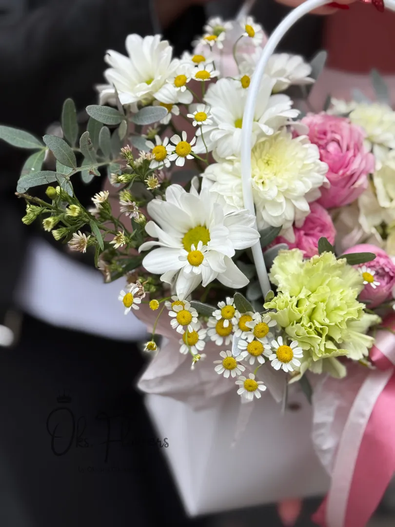 Подарите близкому человеку не просто букет — а настоящую «Цветочную Ласку». Это нежное объятие из свежих цветов: пастельно-розовые пионовидные розы, белоснежные хризантемы, кремовые гвоздики и мелкие ромашки, которые словно улыбаются вам с каждого уголка композиции. Зелёные листья эвкалипта и воздушные сухоцветы добавляют глубину и текстуру, делая букет по-настоящему живым и природным.
