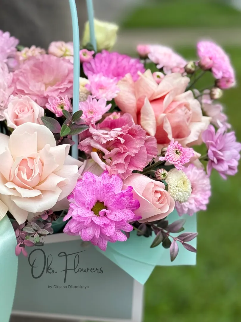 Упакован в стильную матовую коробку мятного цвета с ручками — удобен для переноски и выглядит как маленький шедевр флористики. Украшен лентами в тон — мятной и кремовой — создающими ощущение праздника и заботы.
