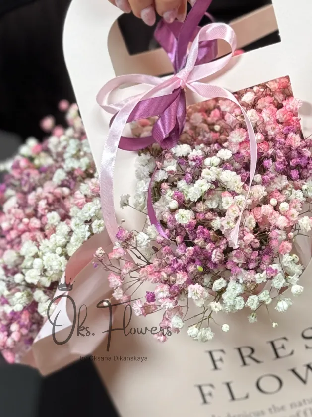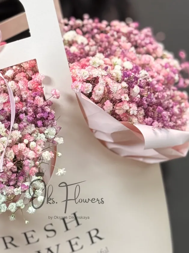 Это нежное облако из сухих гипсофил, окрашенных в пастельные оттенки розового, фуксии и белого — словно сны, упакованные в подарок. Лёгкий, воздушный, долговечный — он идеален для тех, кто ценит уют, романтику и вечную красоту. Упакованный в стильную крафтовую сумку с лентами — он станет идеальным спутником в любой момент: на 8 Марта, День рождения или просто чтобы сказать: «Ты — мой самый красивый сон».
