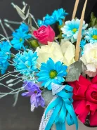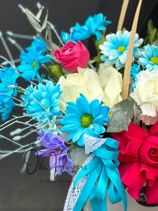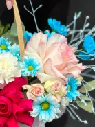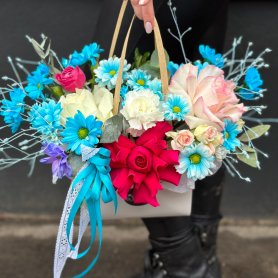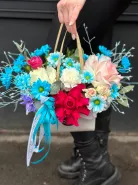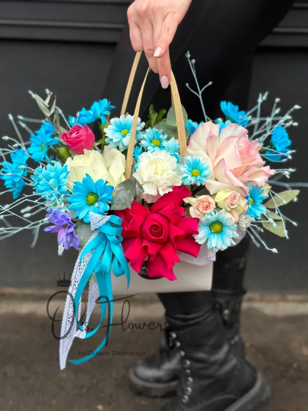 Это яркая, смелая и эмоциональная аранжировка в сумке, где малиновые розы, голубые хризантемы, белые гортензии и персиковые акценты создают ощущение праздника в каждом лепестке. Упакованная с лентами и декором — она идеальна для тех, кто ценит драйв, красоту и безупречный стиль.