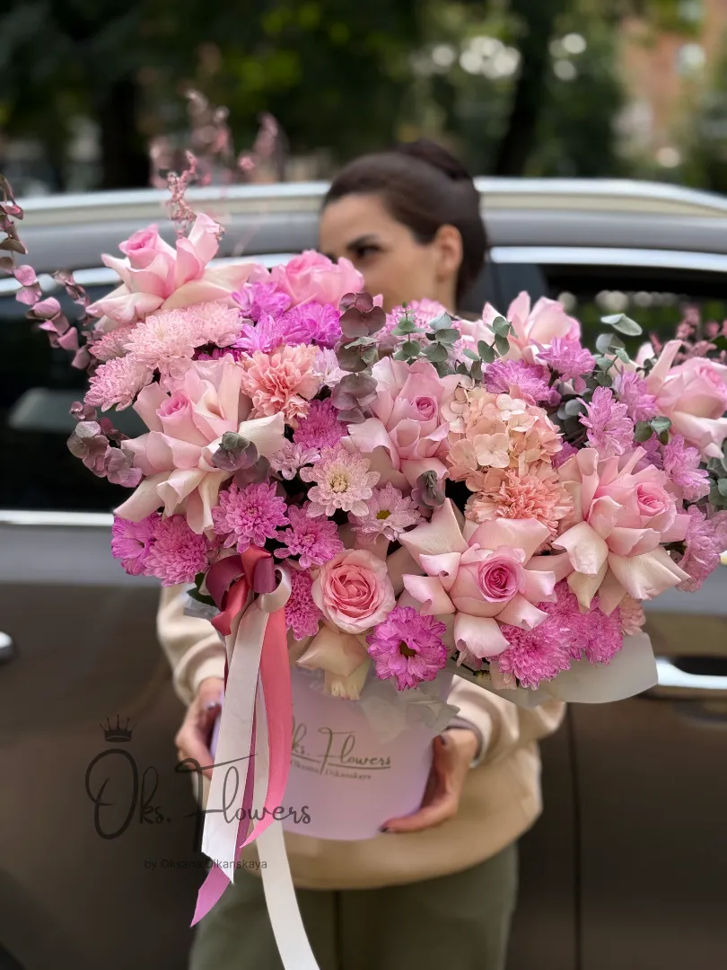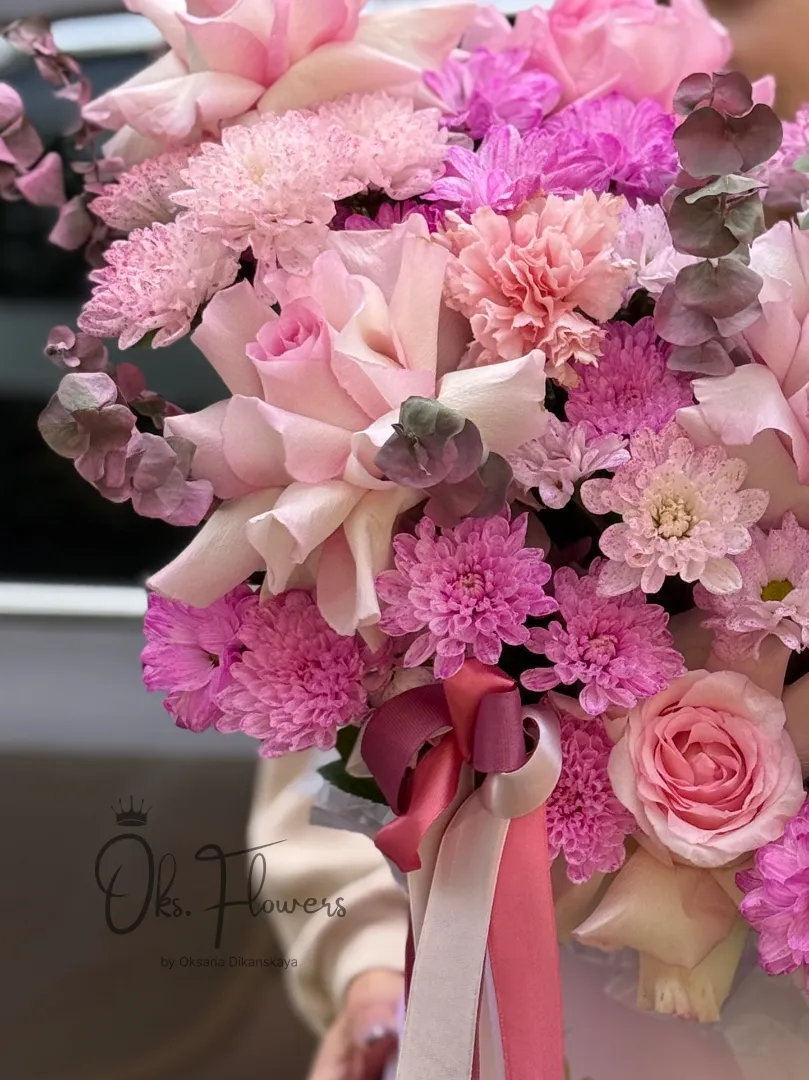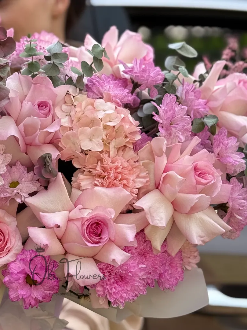 Погрузитесь в атмосферу цветущего сада с букетом «Розовый Сад» — композицией, созданной для тех, кто ценит изысканность и эмоциональную глубину. Крупные нежно-розовые розы, пастельные гортензии, яркие фуксии и воздушные хризантемы образуют гармоничный ансамбль, словно сотканный из закатных лучей и утренней росы. Дополняют композицию свежий эвкалипт и сухоцветы — придающие объём, текстуру и природную свежесть.