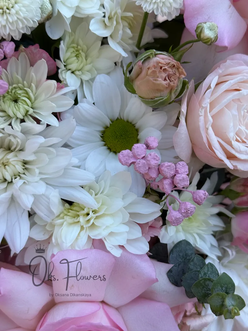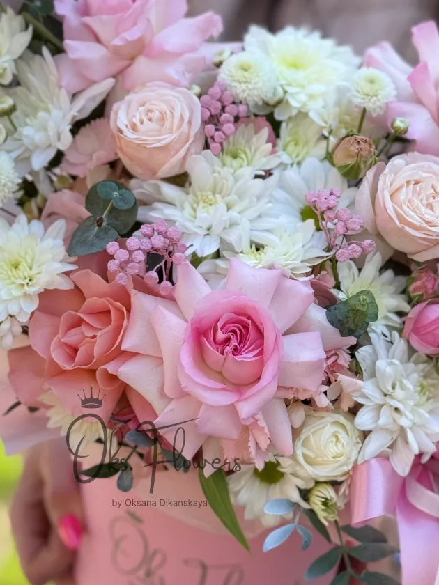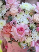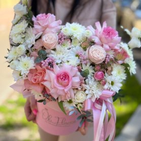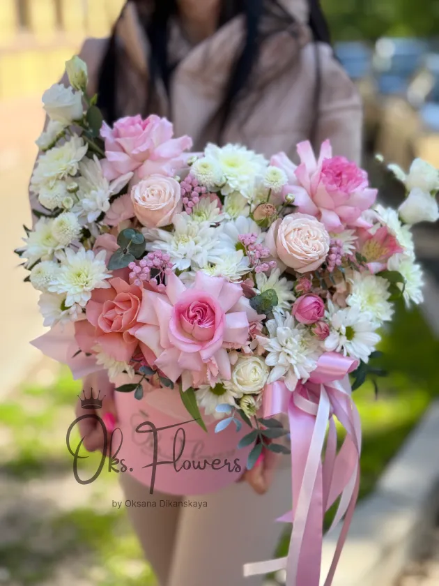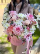 Это нежная, плавная композиция из розовых и белых цветов, словно танец в свете заката — лёгкий, изящный и полный чувства. Упакованная в розовую коробку с длинными лентами — она идеальна для тех, кто ценит романтику, гармонию и женственность.
