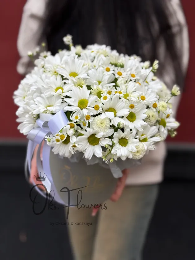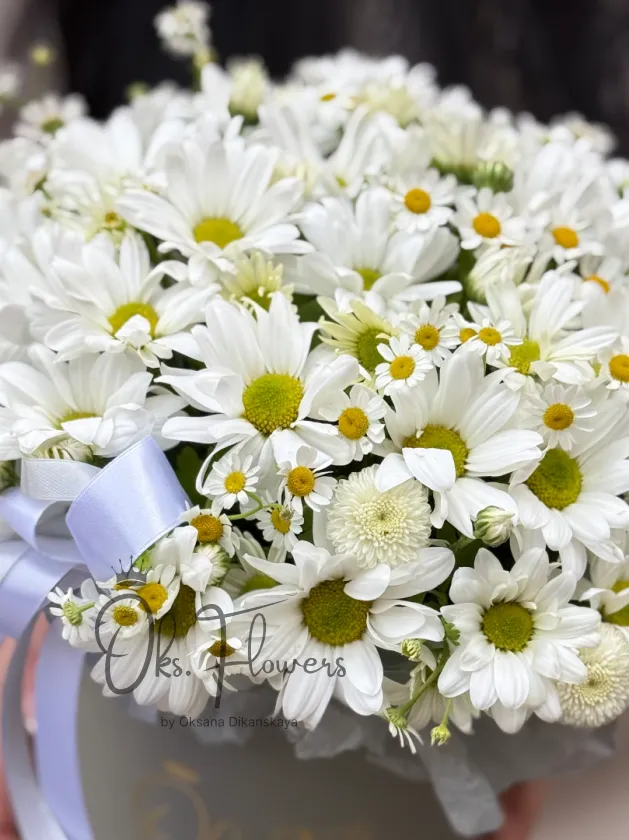 Это чистота, свежесть и доброта в каждом лепестке: белоснежные ромашки, словно усыпанные утренней росой, создают ощущение бесконечного луга под ясным небом. Упакованные в элегантную коробку с нежной лентой — они идеальны для тех, кто ценит простоту, искренность и светлые чувства.