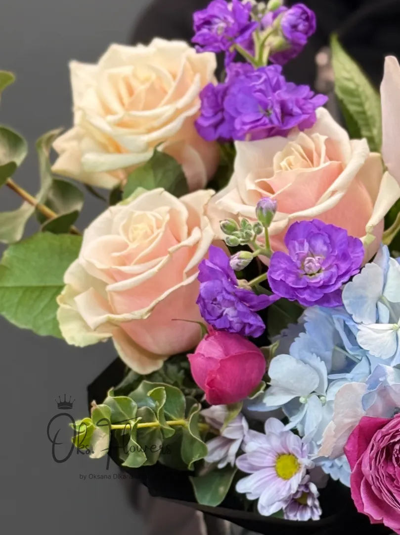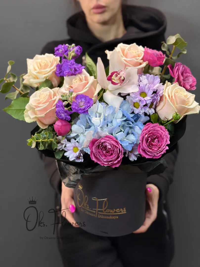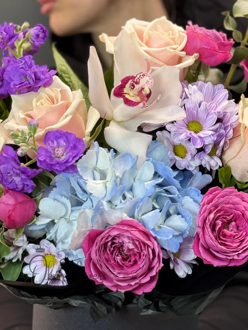 Это волшебная композиция, где пастельные розы, синие гортензии, фиолетовые акценты и нежная орхидея создают ощущение сказочного сада, увиденного во сне. Упакованная в глубокую чёрную коробку — она идеальна для тех, кто ценит изысканность, мечтательность и яркую эстетику.