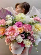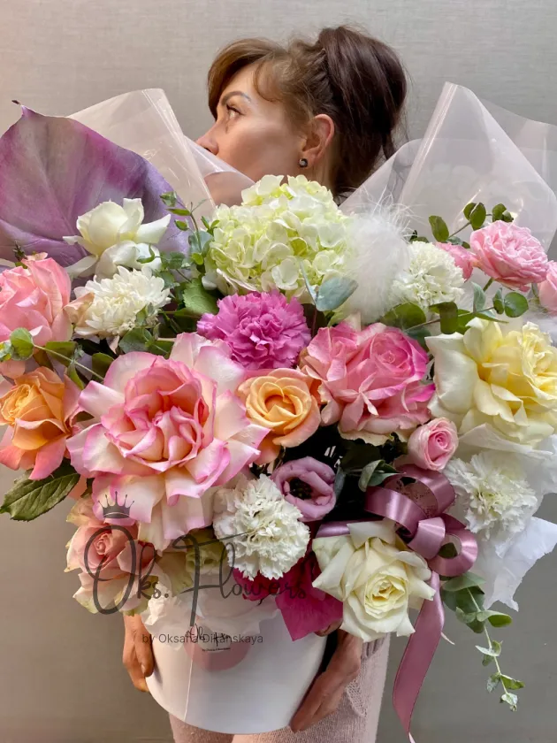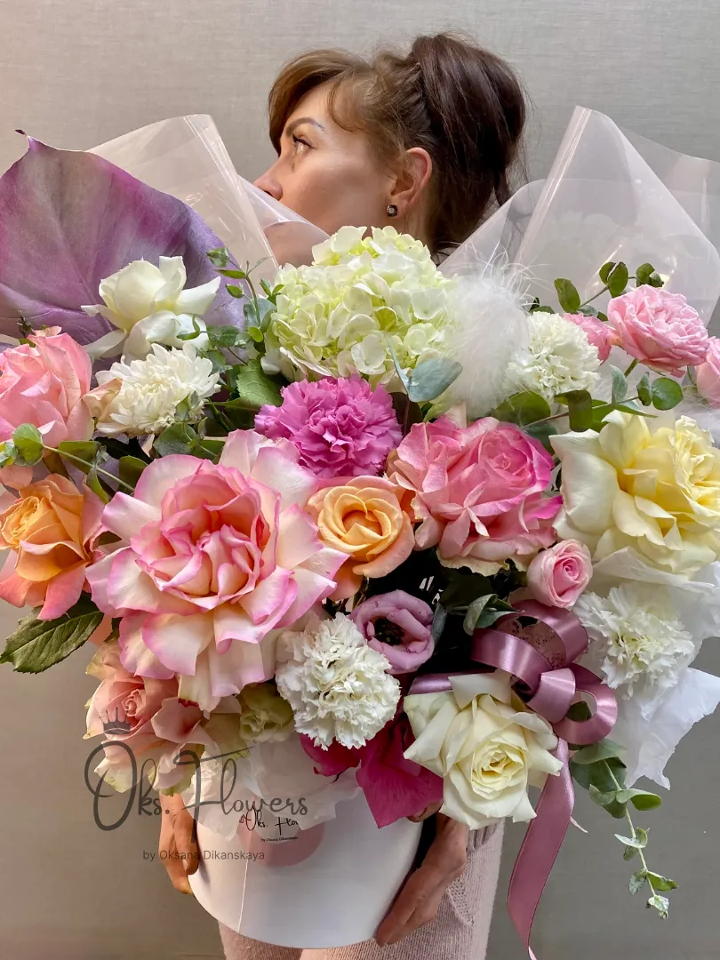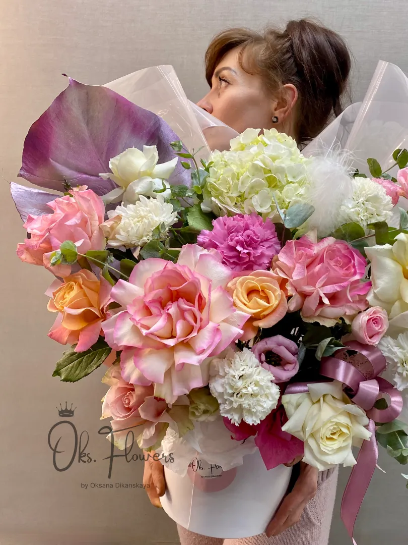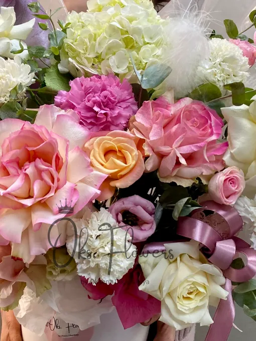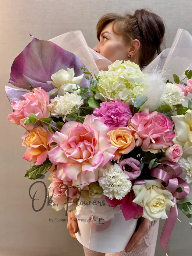 Это воздушная, многослойная и нежная композиция в коробке, где персиковые, розовые и кремовые розы переплетаются с хризантемами и пушистыми перьями — словно первые лучи солнца, касающиеся цветов. Идеальна для тех, кто ценит романтику, объём и праздничное настроение.