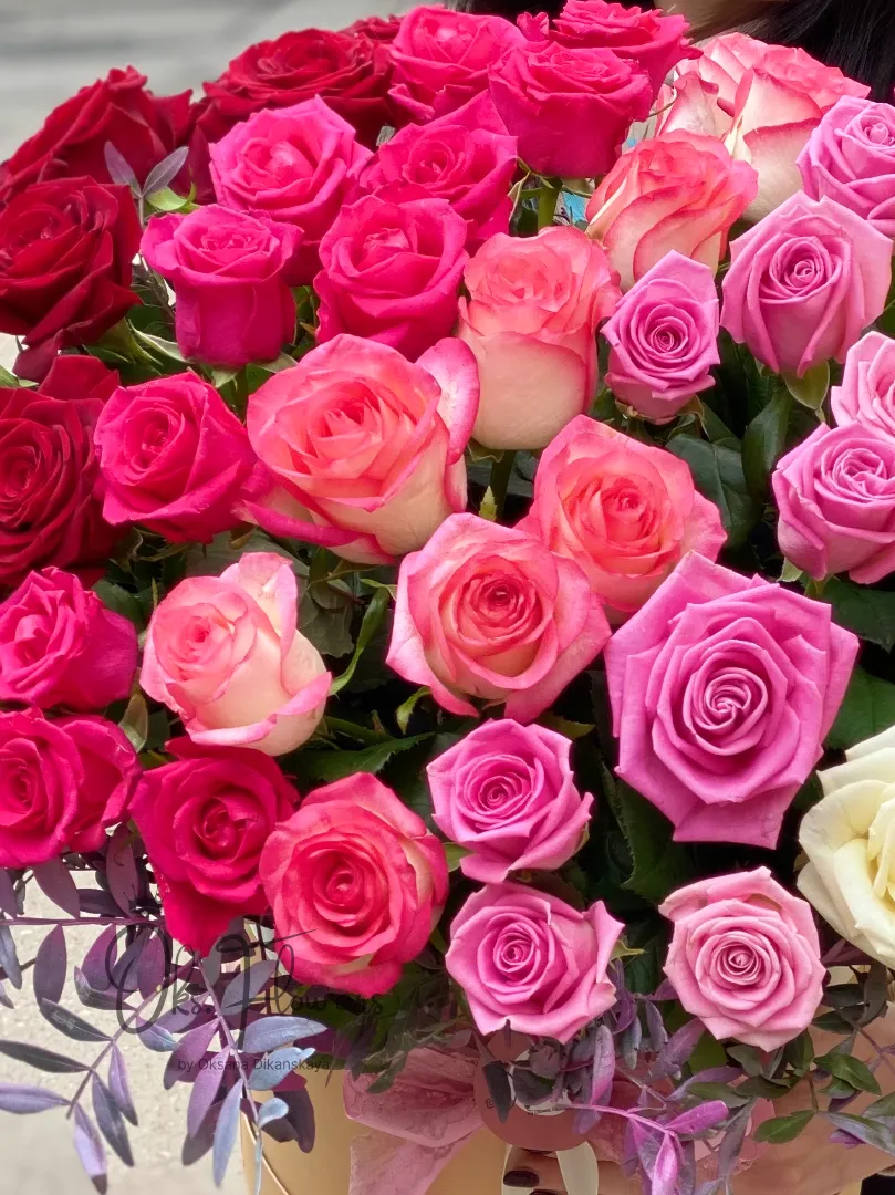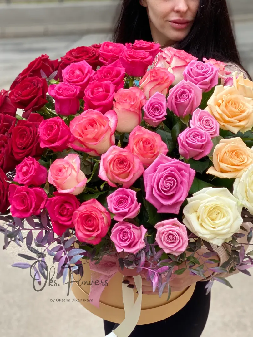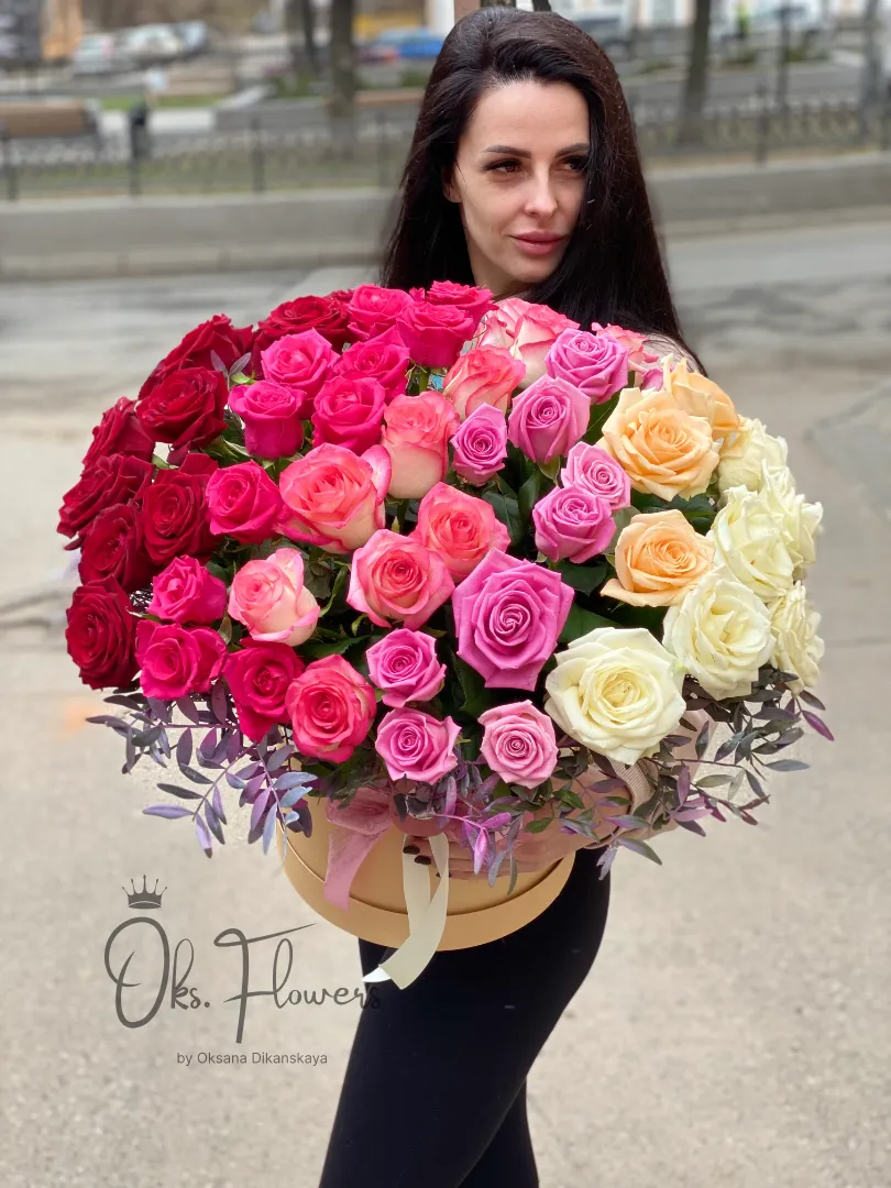 Это огромная, яркая и эмоциональная композиция в коробке, где красные, розовые, персиковые и белые розы создают эффект градиента — словно радуга, остановившаяся в ваших руках. Идеальна для тех, кто ценит масштаб, красоту и глубокие чувства.