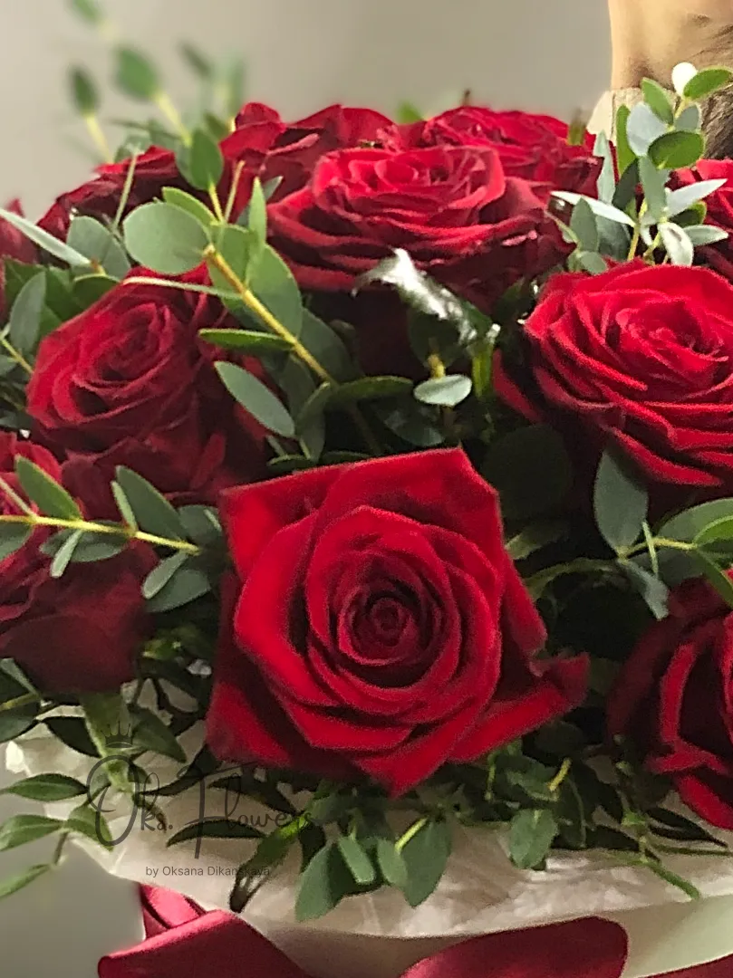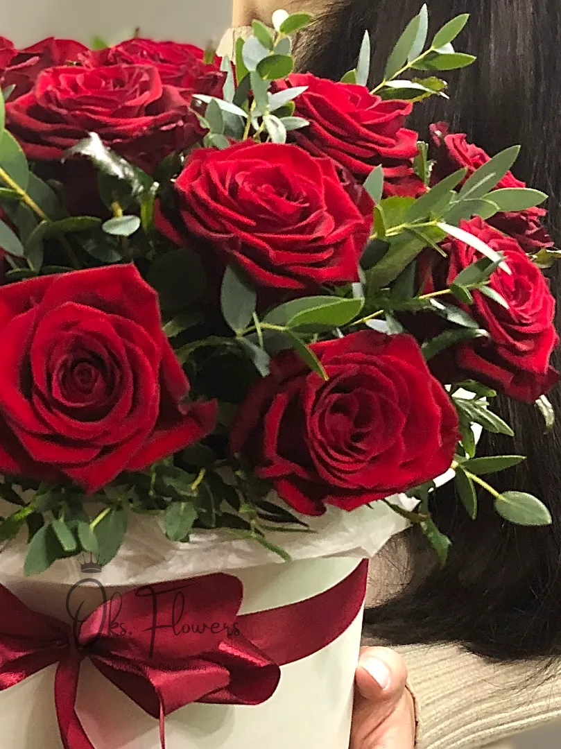 Это роскошная, насыщенная и страстная композиция в белой коробке, где глубокие красные розы, словно живое пламя, сочетаются со свежим эвкалиптом — создавая ощущение силы, любви и безупречного вкуса. Идеальна для тех, кто ценит классику, эмоции и вечную красоту.