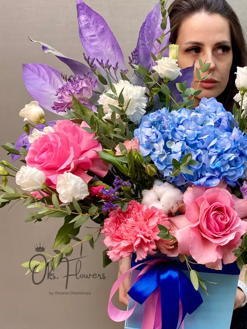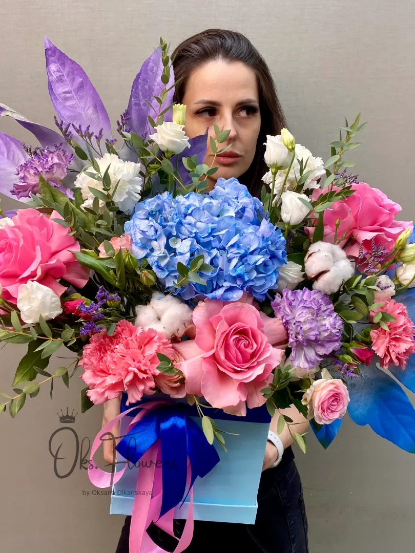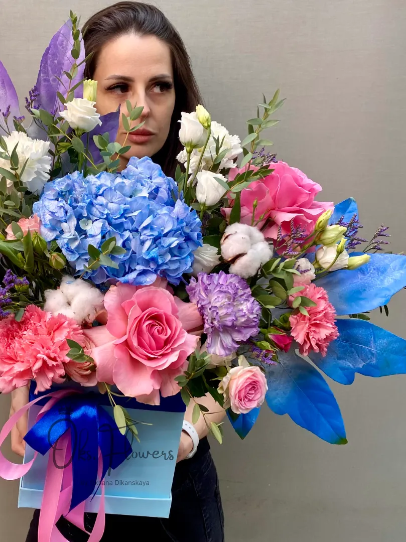 Это яркая, смелая и эмоциональная аранжировка в коробке, где малиновые розы, голубые гортензии, фиолетовые акценты и хлопок создают ощущение праздника в каждом лепестке. Идеальна для тех, кто ценит драйв, красоту и безупречный вкус.