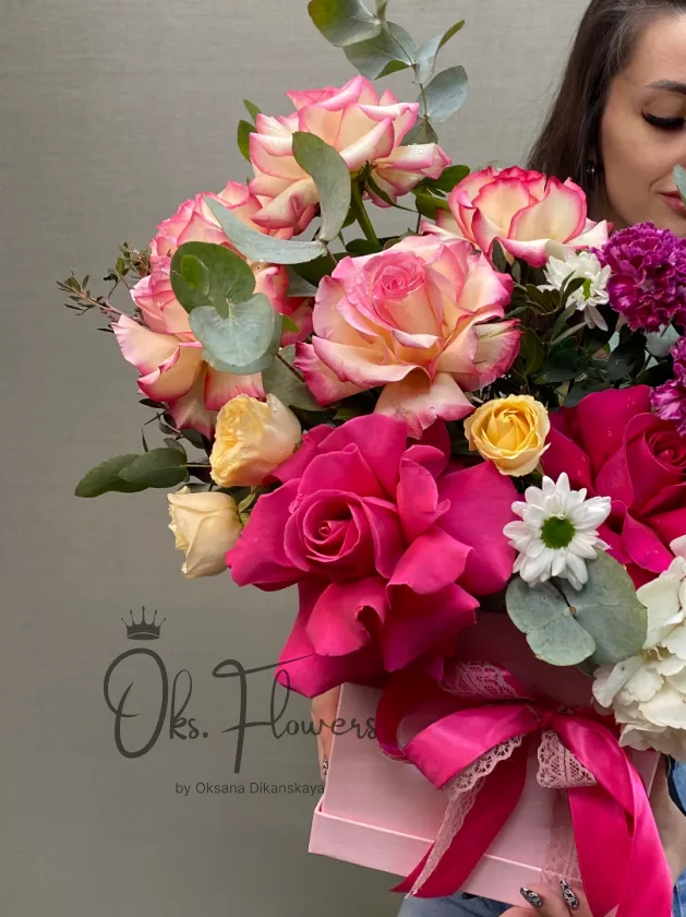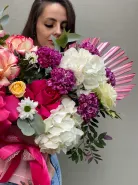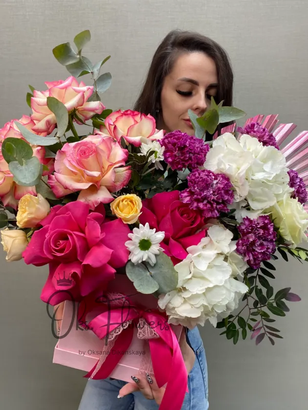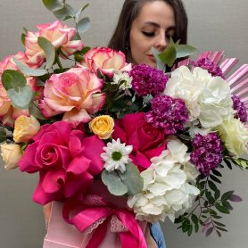 Это мощная, яркая и страстная композиция в коробке, где малиновые и персиковые розы, белые гортензии и фиолетовые акценты создают эффект взрыва эмоций. Идеальна для тех, кто ценит силу чувств, красоту и безупречный стиль.