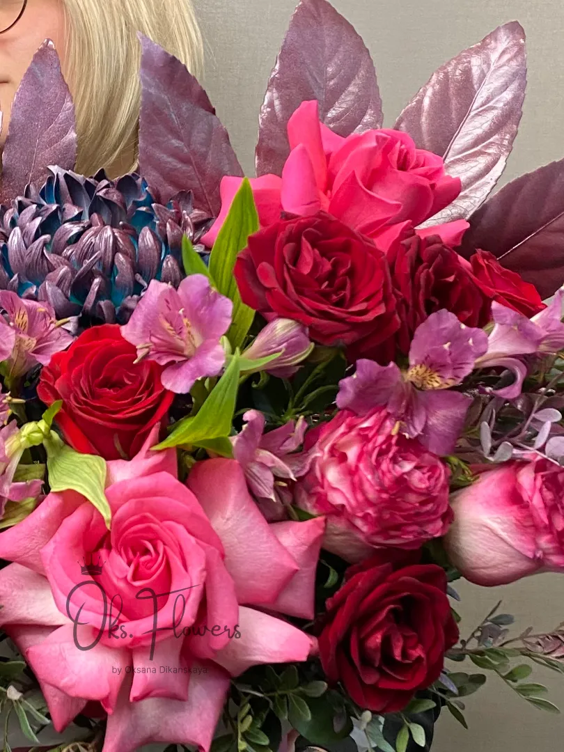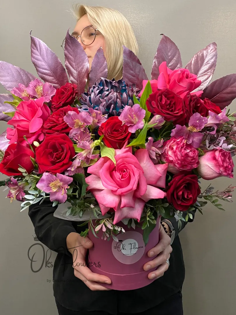 Яркая шляпная коробка в оттенках розового и бордо с изысканными розами, протеей, альстромерией и декоративной листвой. Контраст фактур и насыщенных цветов создаёт элегантный и запоминающийся образ.