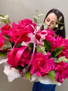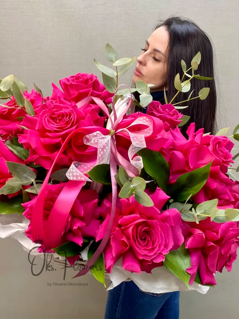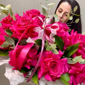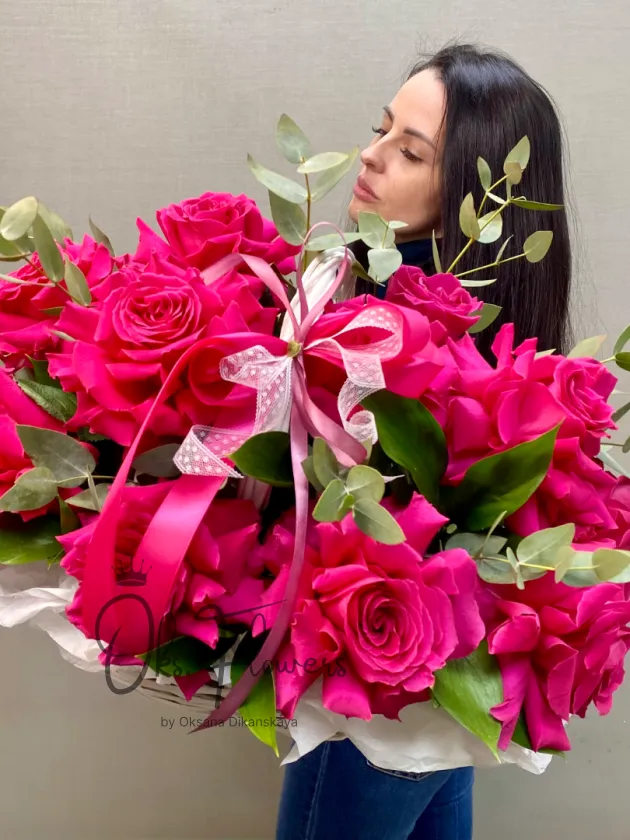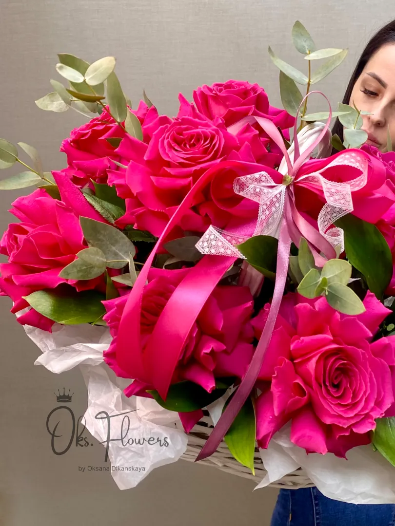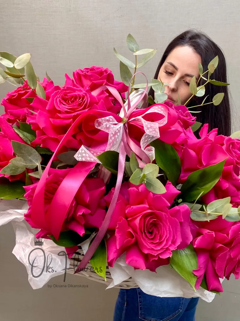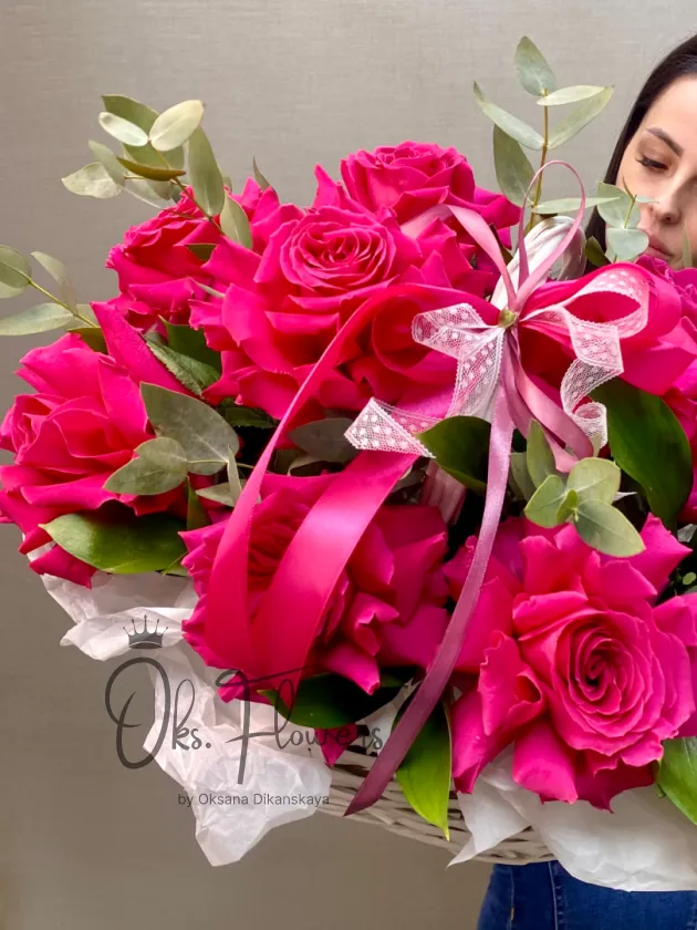 Это мощный, яркий и страстный подарок из насыщенно-розовых роз, словно пламя, наполняющее пространство теплом и любовью. Уложенный в вместительную плетёную корзину — идеален для тех, кто ценит масштаб, эмоции и безупречную красоту.