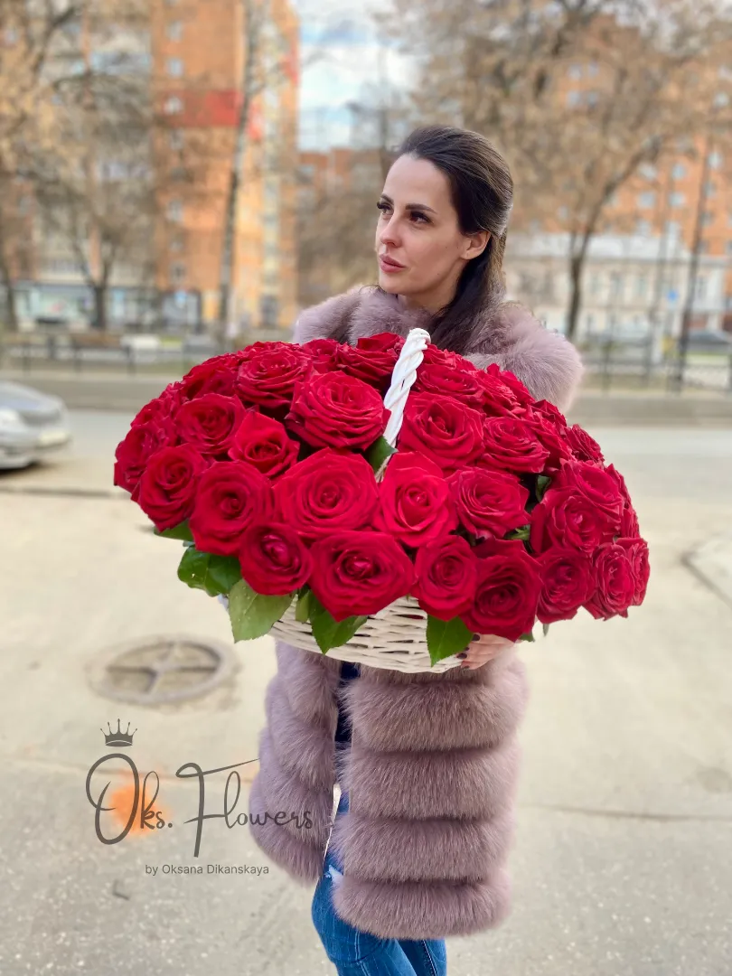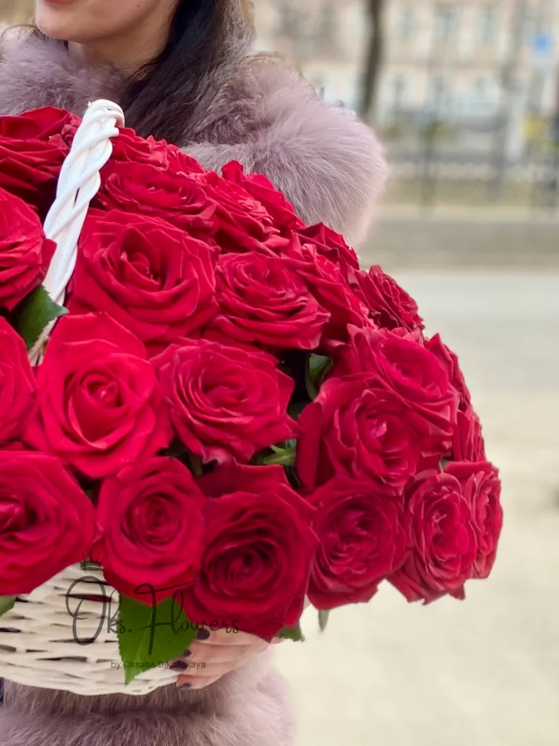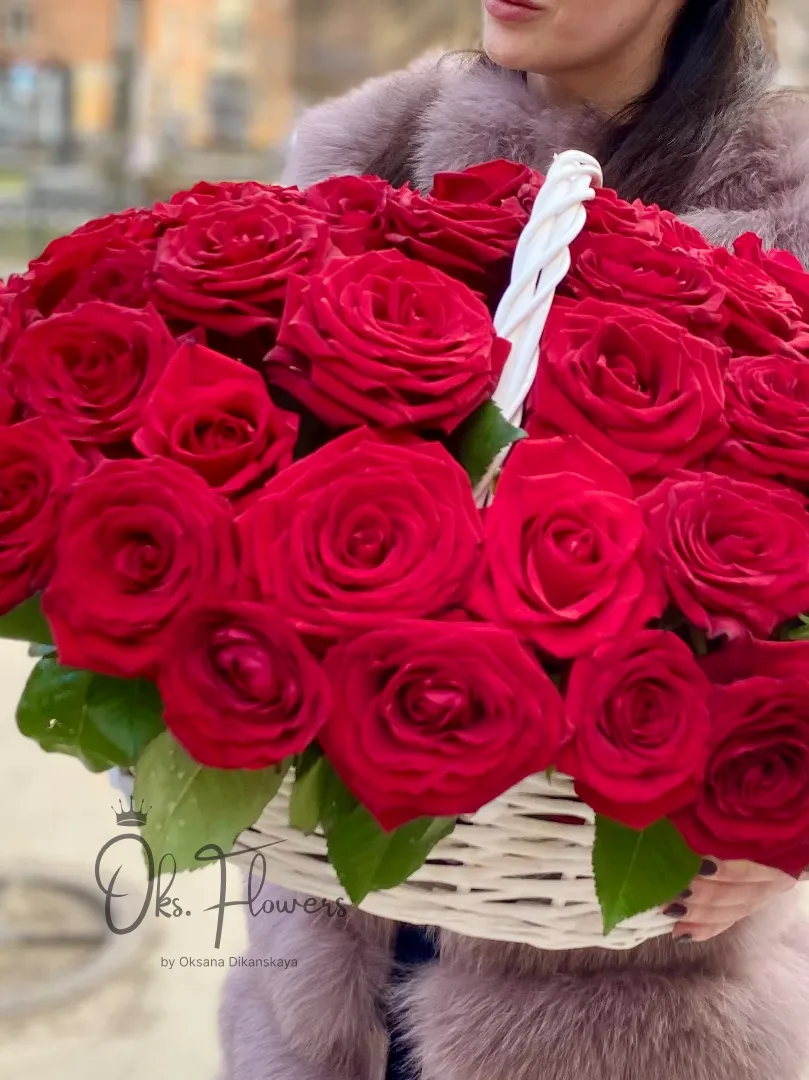 Это мощный, насыщенный и роскошный подарок из красных роз, уложенных в плетёную корзину — символ страсти, силы и безупречного вкуса. Идеальна для тех, кто ценит роскошь, эмоции и вечную красоту.