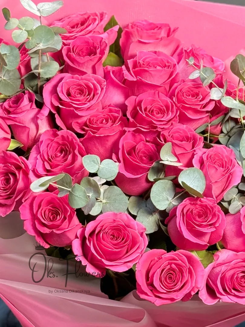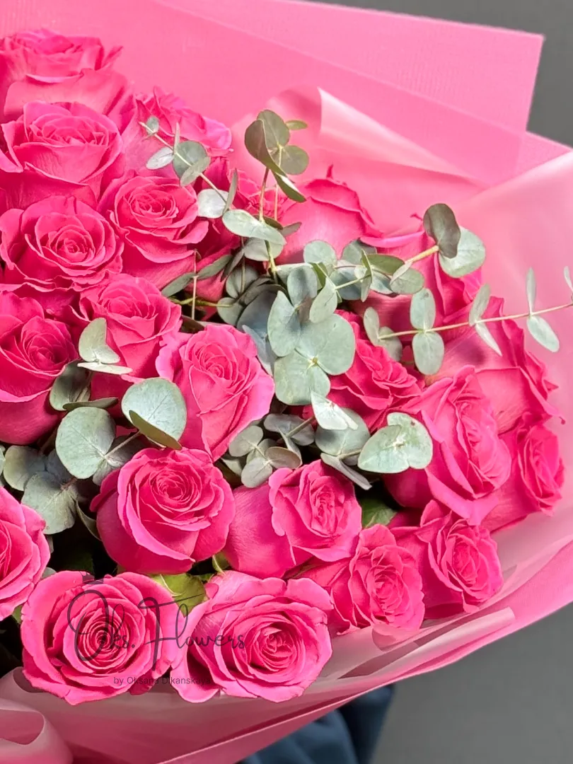 Это насыщенная, глубокая композиция из малиновых роз, словно отлитых из закатного света, дополненная свежим эвкалиптом для лёгкости и контраста. Упакованная в тонкую малиновую бумагу с матовым отливом — она идеальна для тех, кто ценит роскошь в деталях, сдержанную страсть и утончённую элегантность.