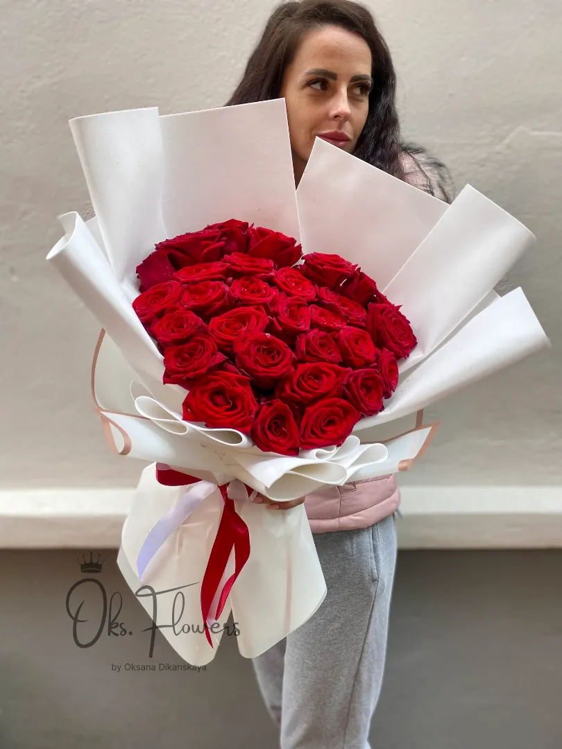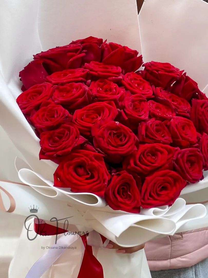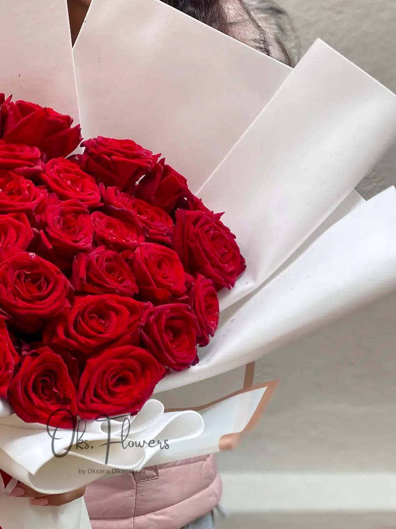 Это великолепный, насыщенный и страстный букет из глубоких красных роз — символ чистой страсти и преданности. Упакованный в белую бумагу с лентой — идеален для тех, кто ценит классику, силу чувств и вечную красоту.