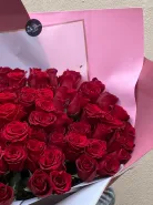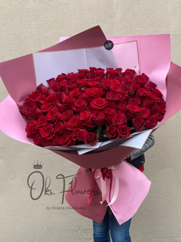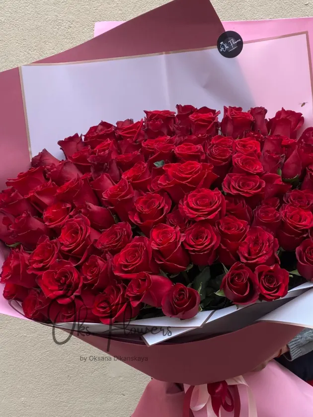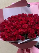 Роскошный букет из 101 красной розы — воплощение страсти, любви и роскоши. Каждый цветок отобран вручную, чтобы создать идеальную форму и насыщенный аромат. Упакован в стильную матовую плёнку с розовой лентой.